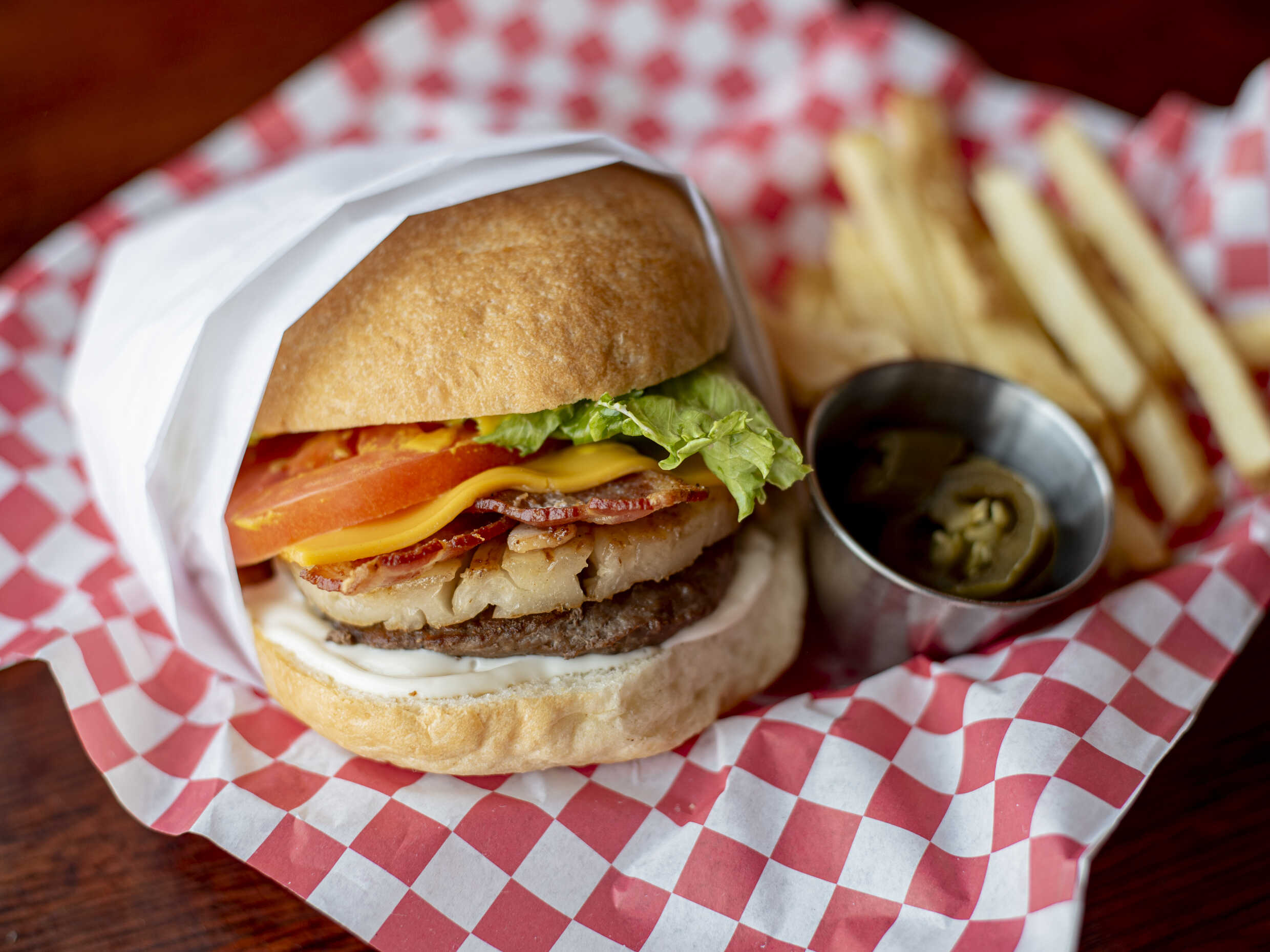 150g Carne de Sirloin, piña asada, tocino, Delicioso Pan Artesanal, Queso Menonita, Lechuga, tomate, aderezada con mayonesa y mostaza.