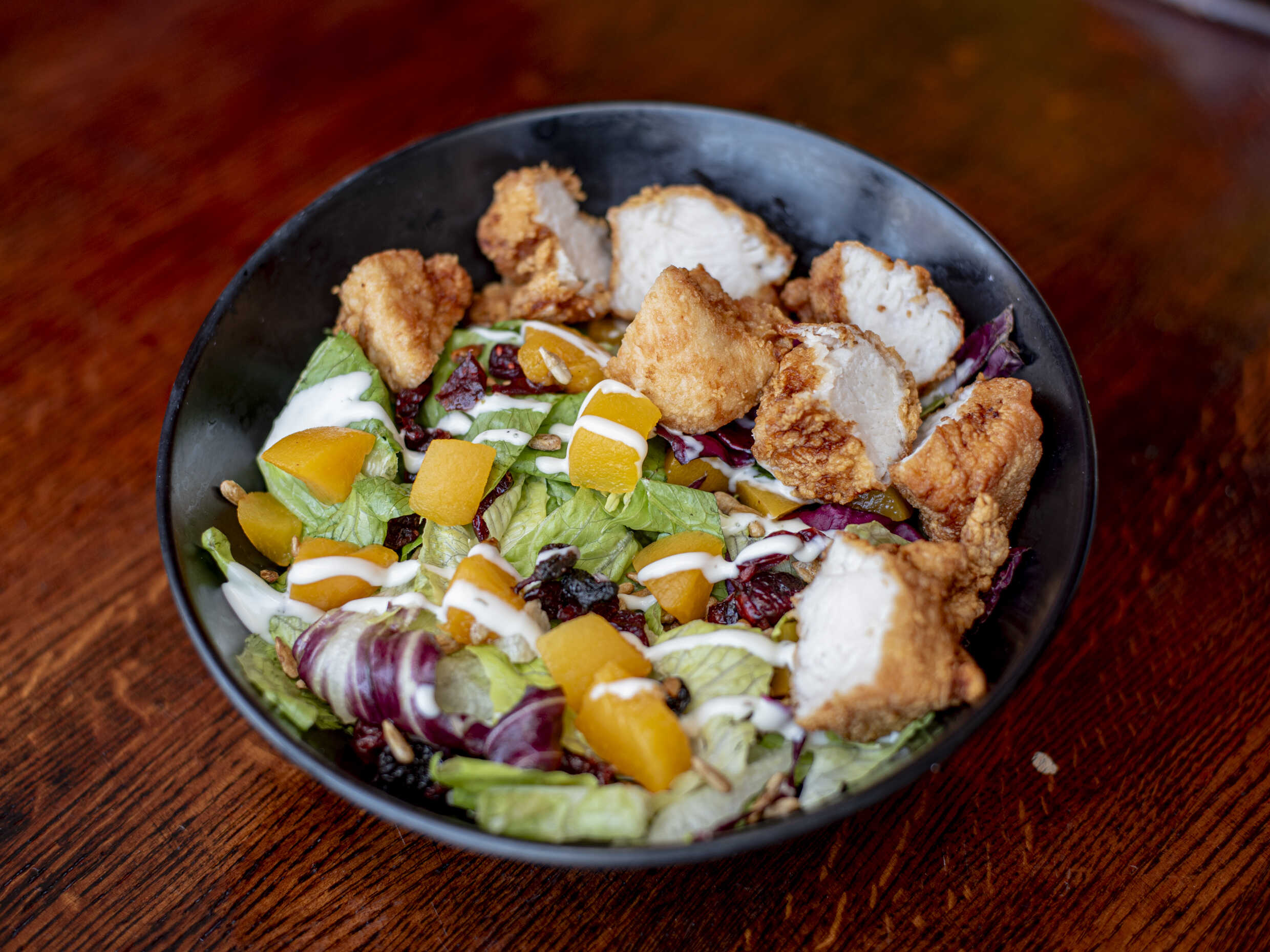 Fresca mezcla de lechugas orgánicas, Durazno en almíbar, pepitas de calabaza garapiñada, uva-pasa y 120g de pollo empanizado, con aderezo de Honey Mustard de la casa