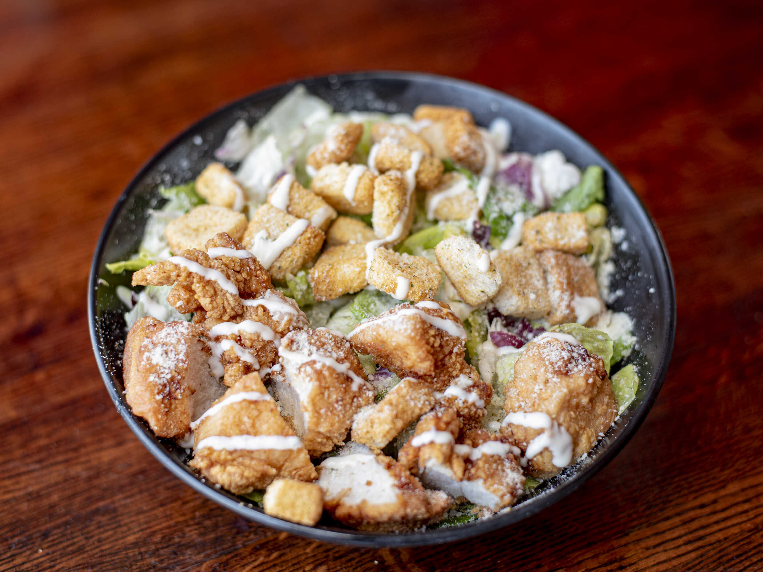 Fresca Mezcla de Lechugas Orgánicas, trozos de tocino, croutones estilo italiano, 120 grms de pechuga de pollo empanizada, espolvoreada con queso parmesano y aderezo parmesano de la casa.
