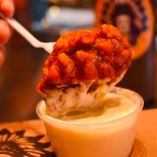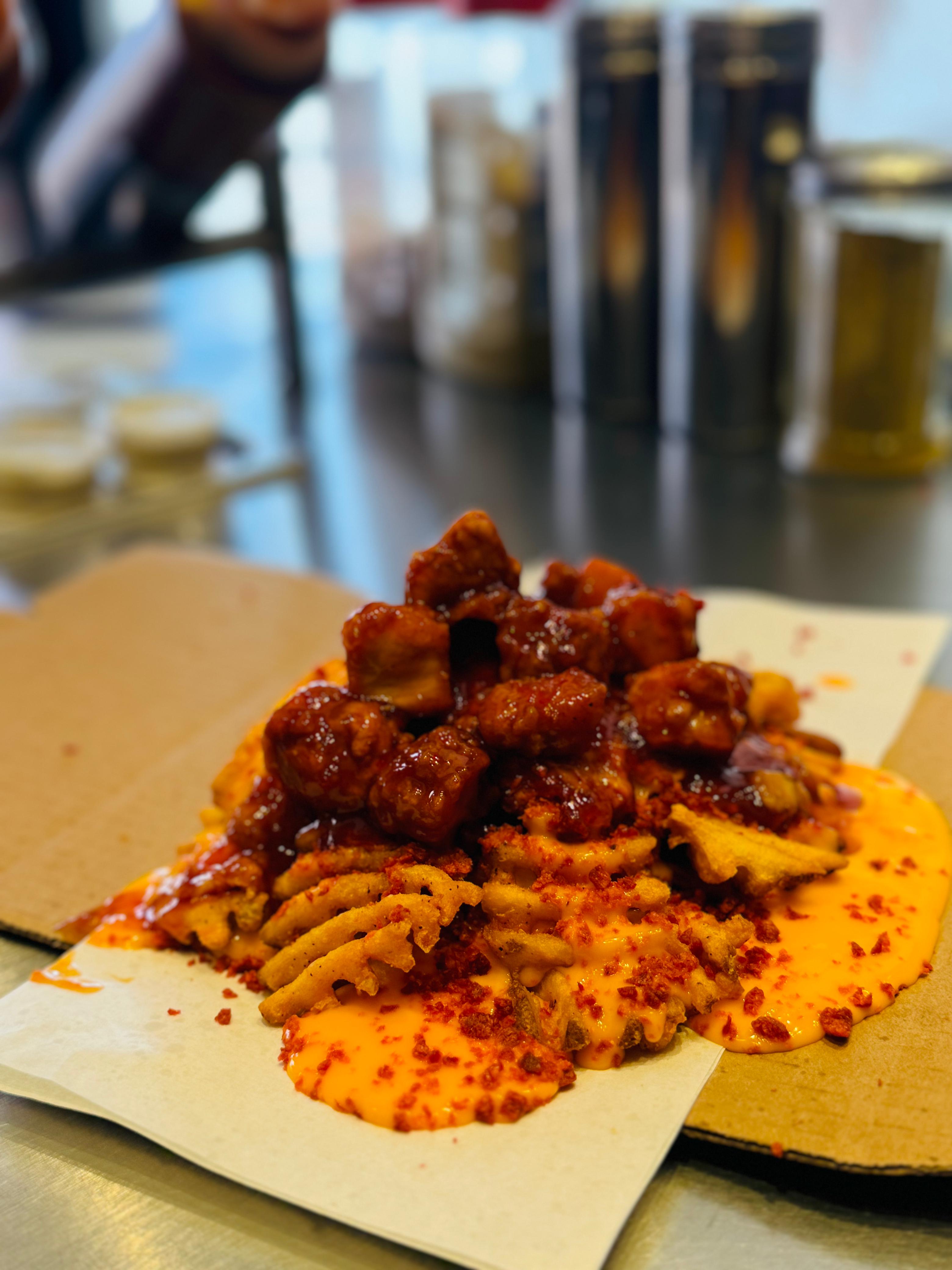 400 gramos de bañados en salsa a elegir, 300 gramos papa Criss Cut bañados en queso amarillo