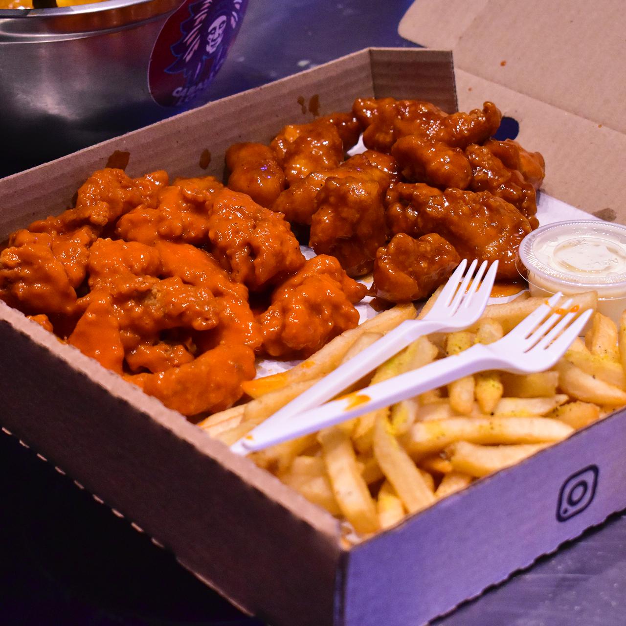 Se entrega en cartón con 300 GR DE BONELESS + 200 GM DE PAPAS FRANCESAS Y RANCH