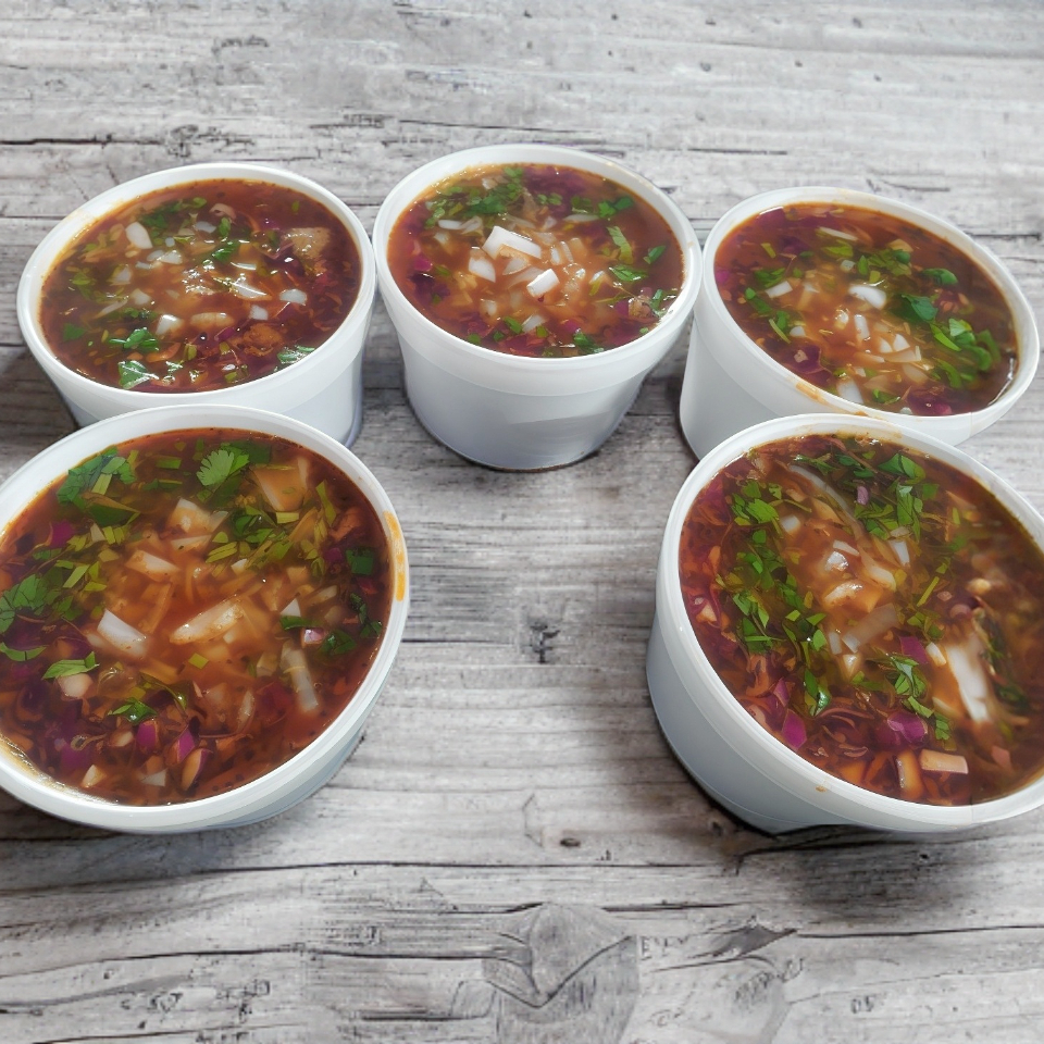 Consomé de birria en un envase de (8 Oz). (No incluye carne de res))