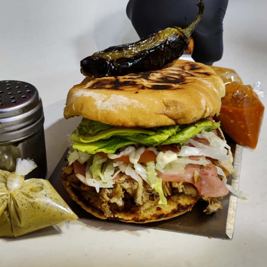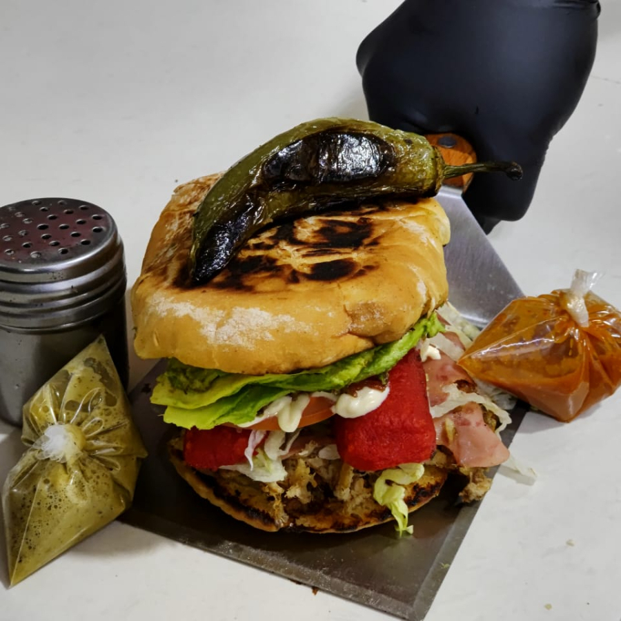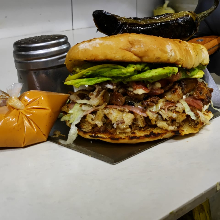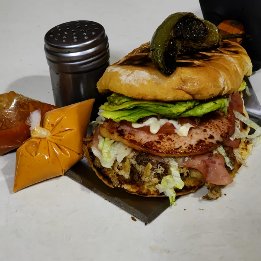 PAN DORADO CON MANTEQUILLA, CARNE DE RES QUESO TRIPOITAS LECHUGA AGUACATE TOCINO TOMATE ADEREZOS
