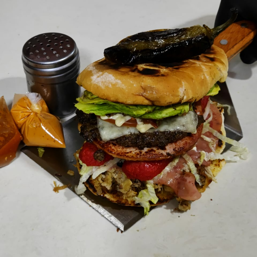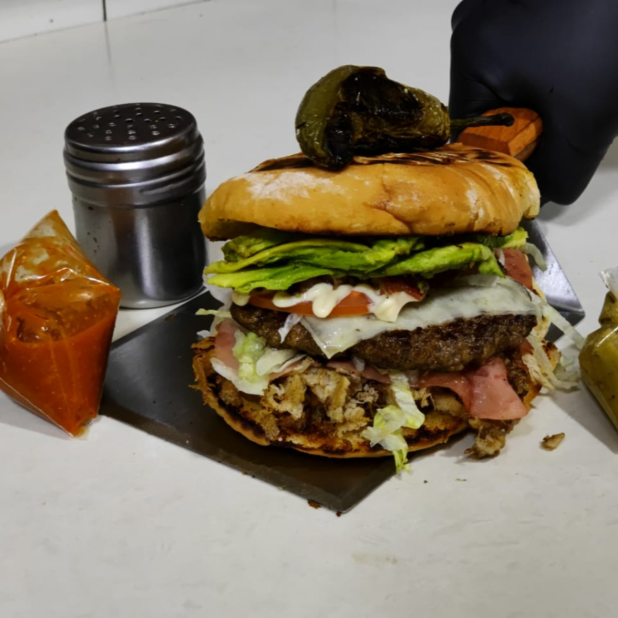 PAN DE BURGER DORADO EN MANTEQUILLA DOS CARNES DE RES CHULETA AUMADA QUESO SALCHICHA CAMPESTRE TOCINO AGUACATE LECHUGA TOMATE ADEREZOS