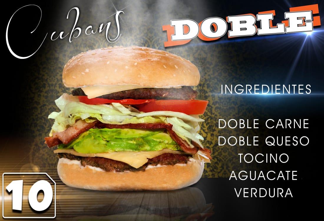 Doble carne,queso, tocino, aguacate y verdura