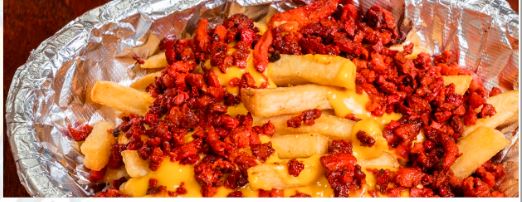 papas francesas , queso amarillo y tocino