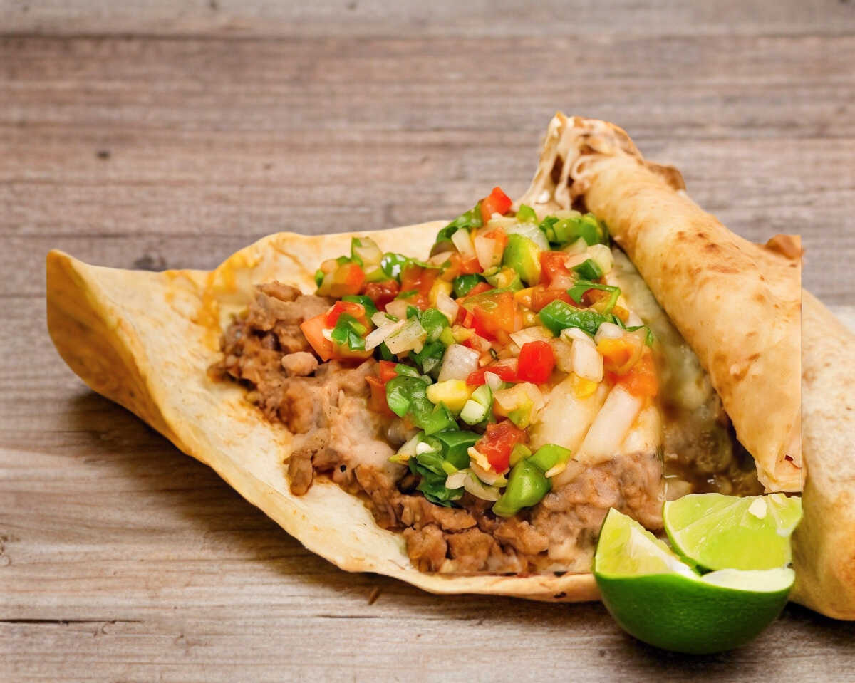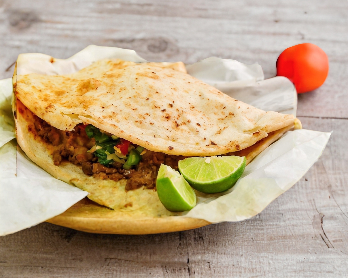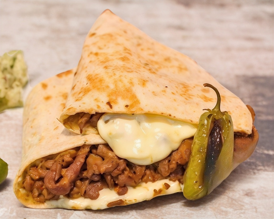 tortilla gigante de harina , carne alpastor , frijoles y asadero