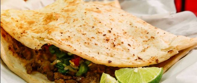 tortilla gigante de harina , carne alpastor , bistec de res , frijoles y asadero