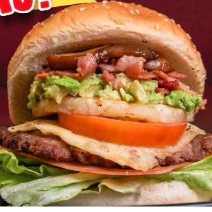 carne de hamburguesa , agucate, tocino , winni , jamon , queso , lehuga y tomate