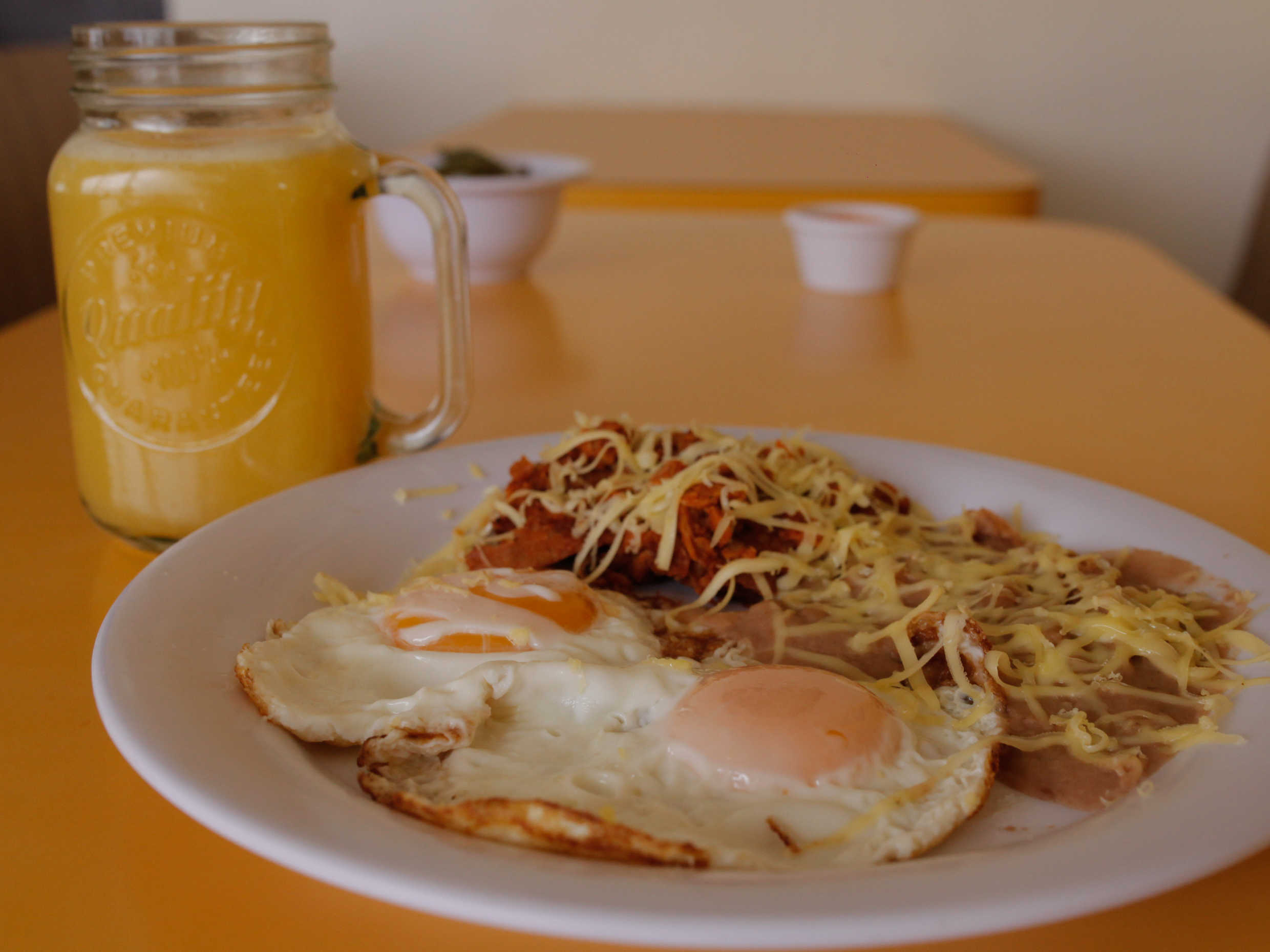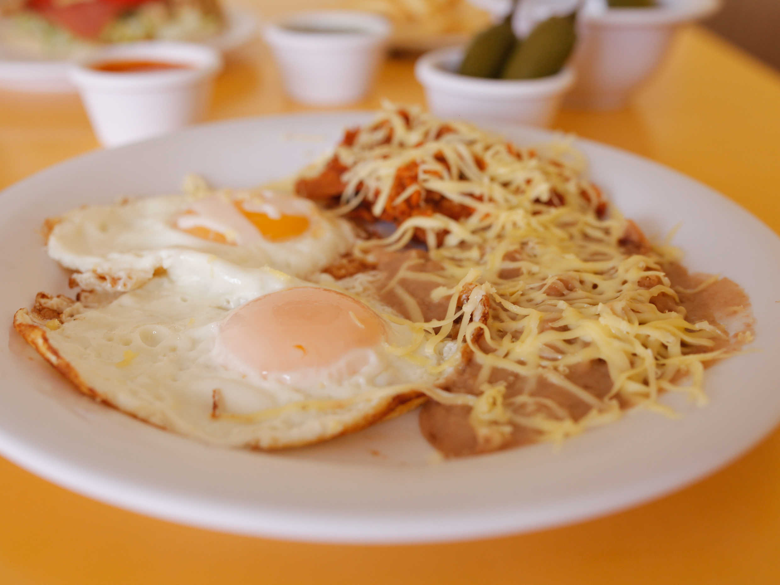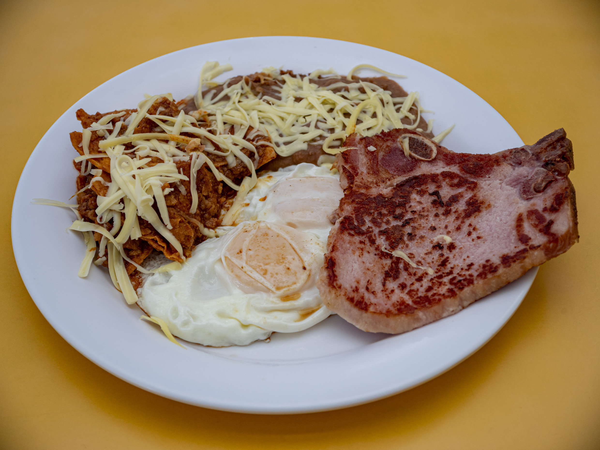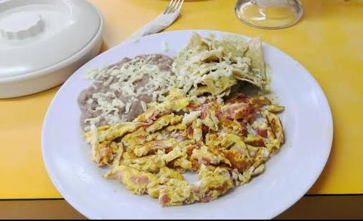 Huevos estrellados sobre tortilla frita bañados de salsa ranchera, queso y tocino.