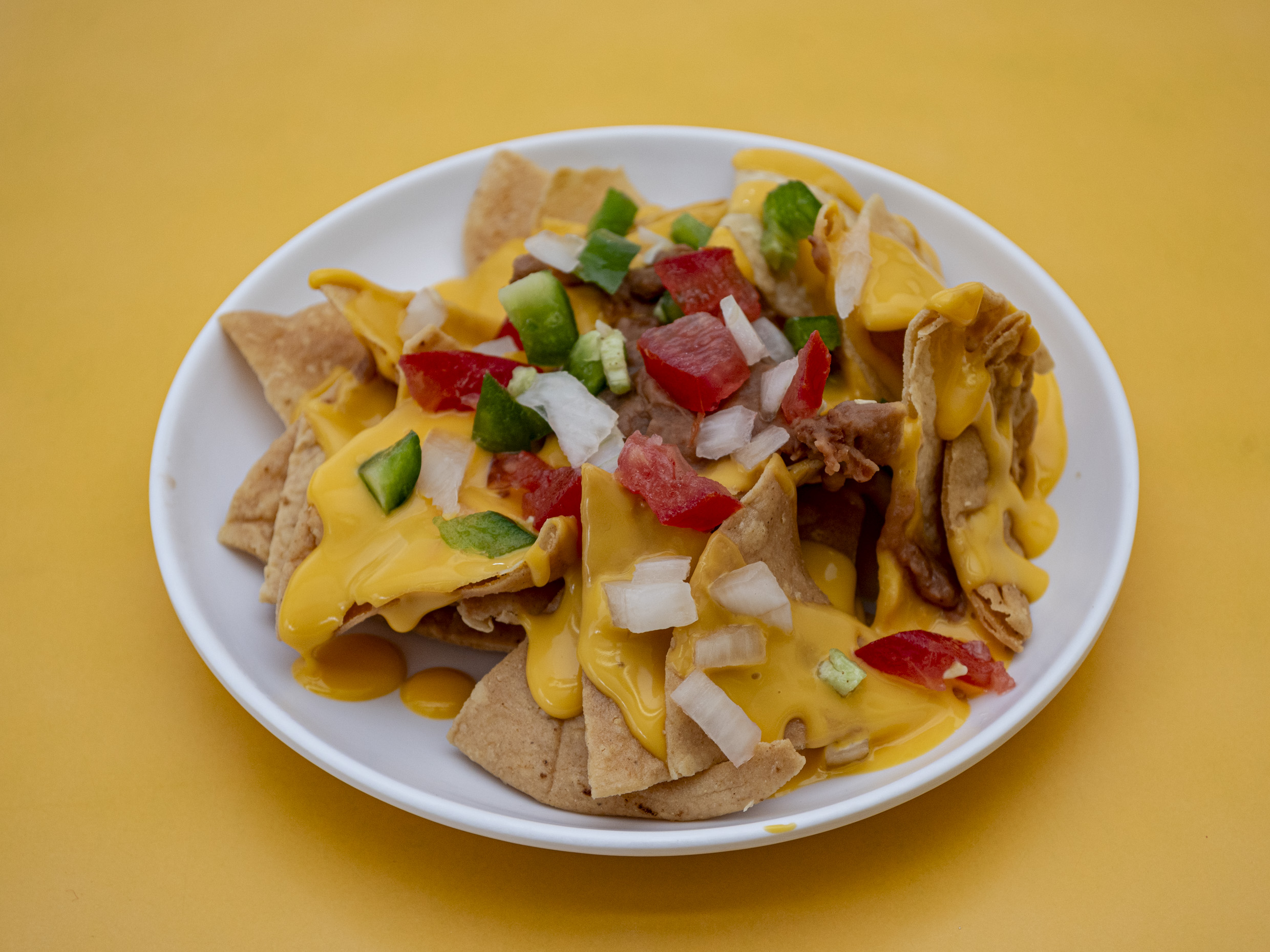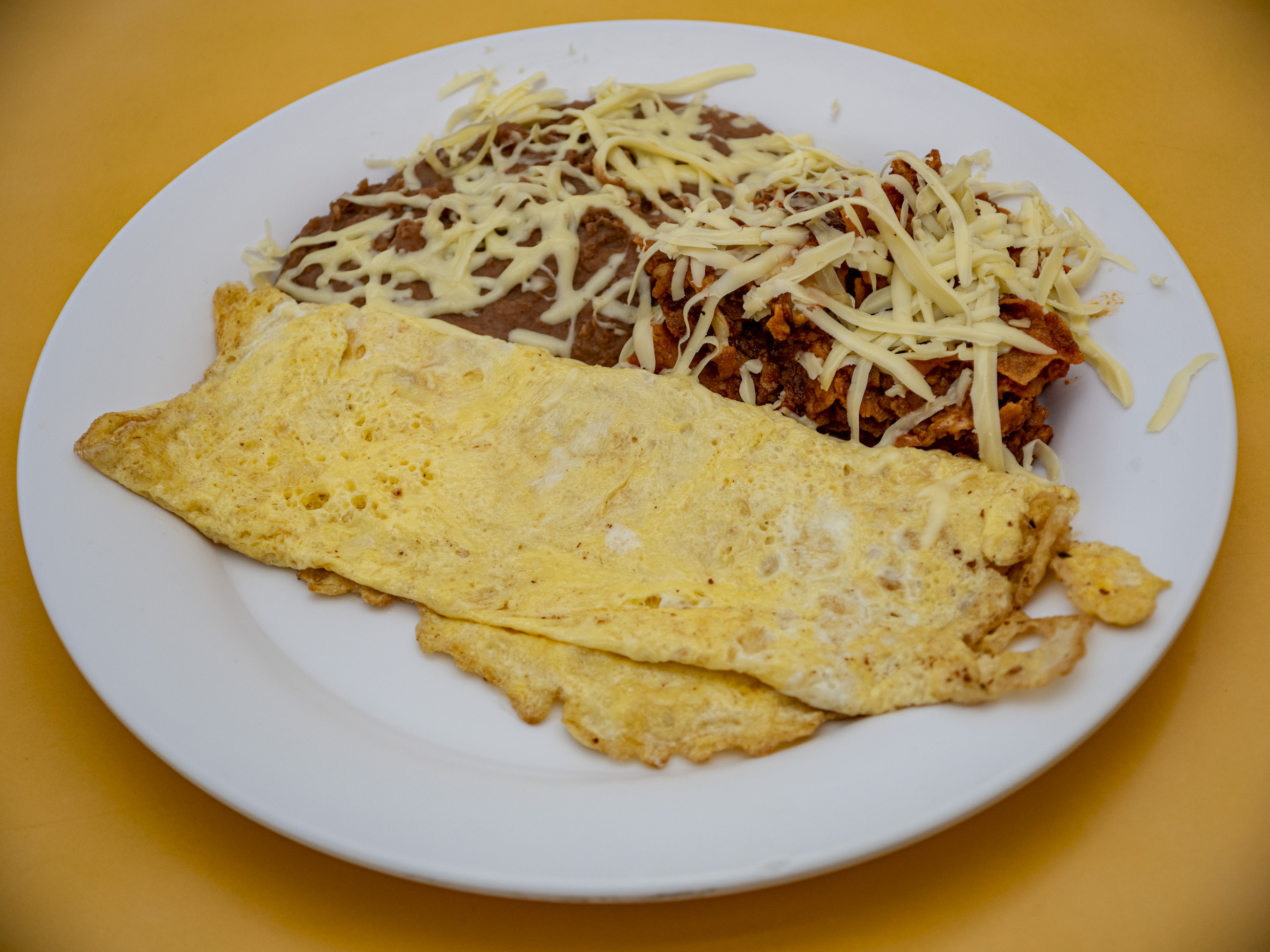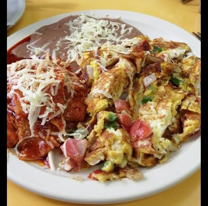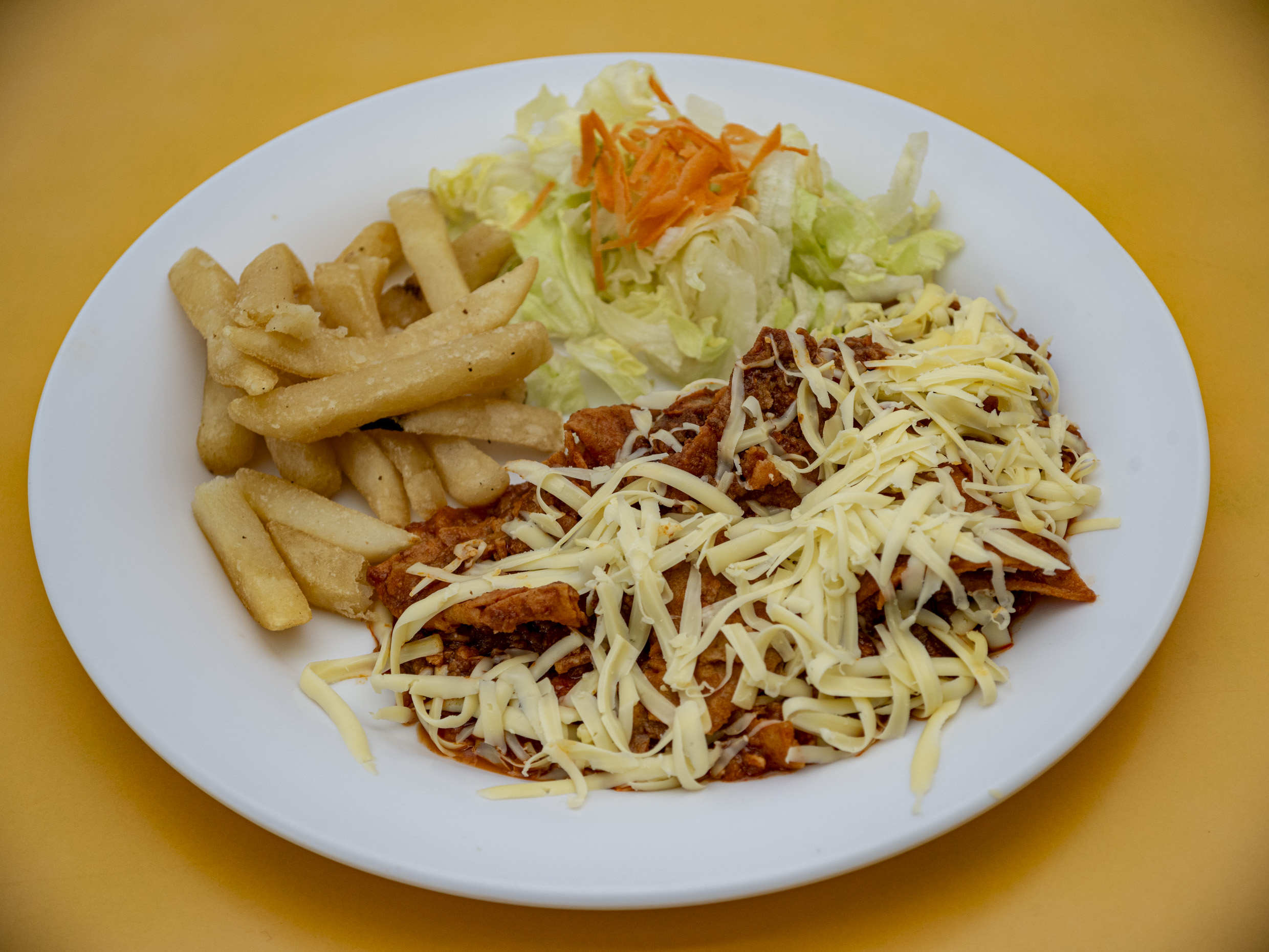 Huevos estrellados sobre tortilla frita bañados de salsa ranchera, queso y tocino.