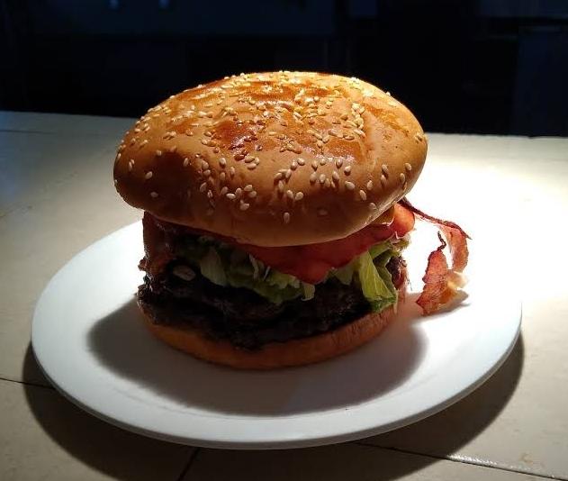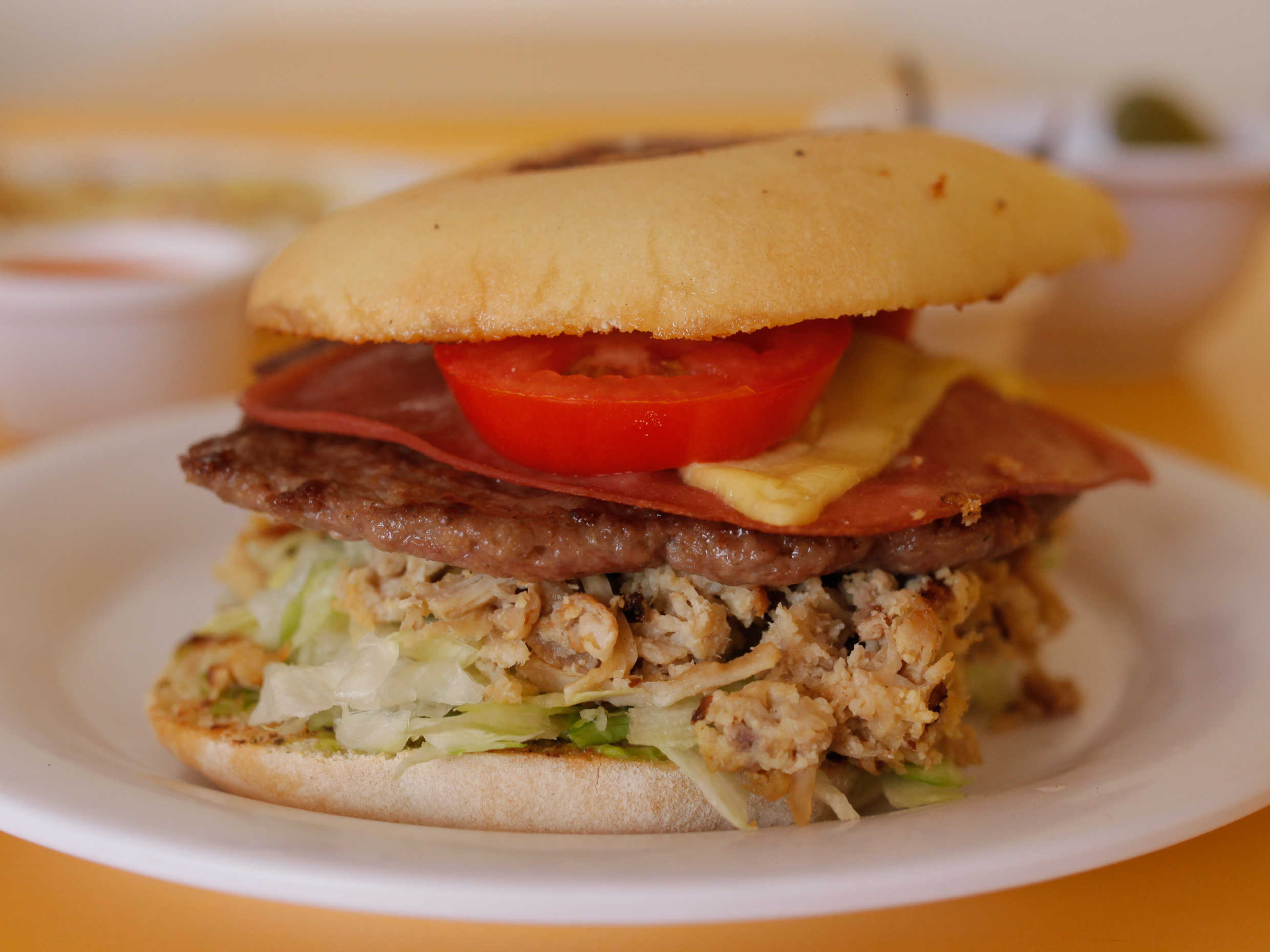 Doble carne, jamón, queso, aguacate, tocino, verdura y aderezos.