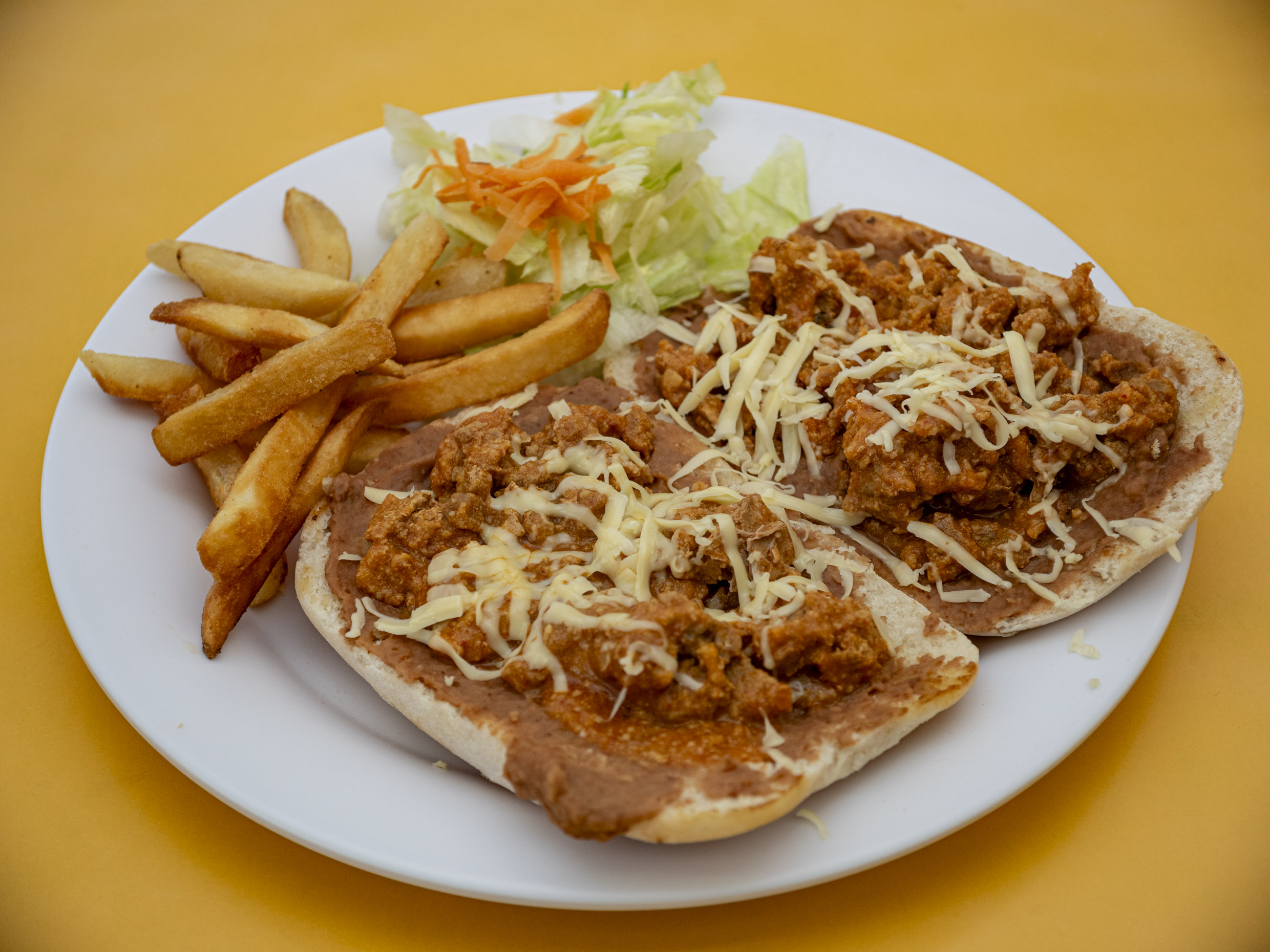 huevos estrellados sobre molletes bañados de salsa ranchera y queso.