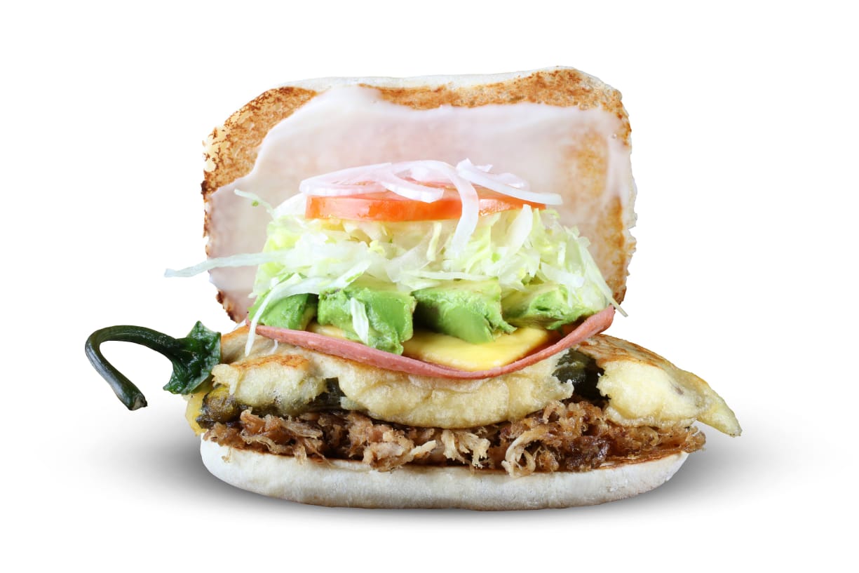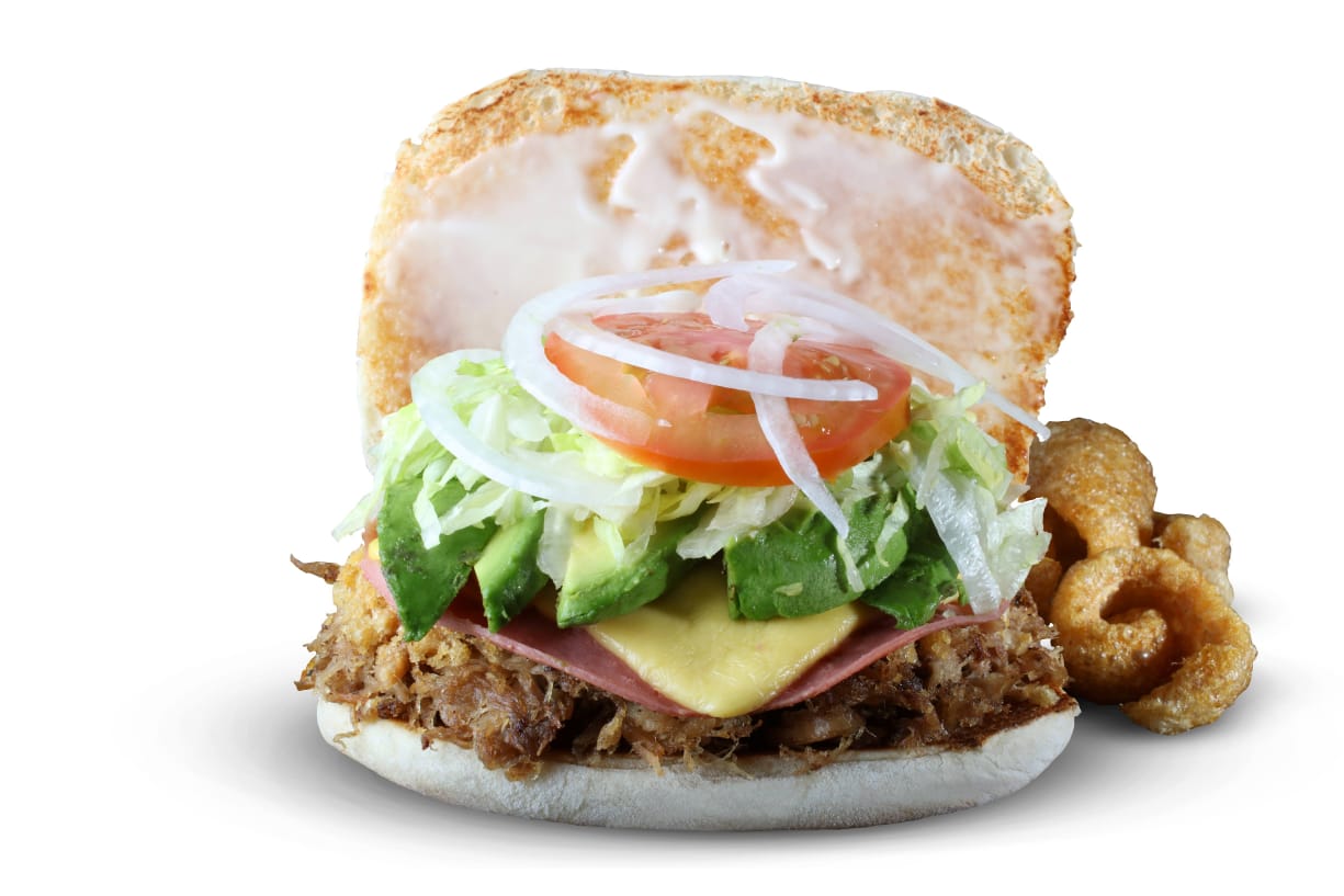 Lomo, jamón, queso y aguacate Lleva aguacate, lechuga, tomate, cebolla y mayonesa