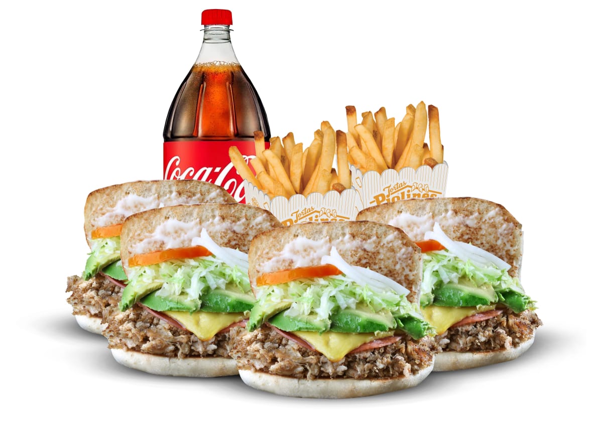 2 Tortas Especiales + 2 Mini Tortas Especiales + 2 Ordenes de papas + 1 Refresco de 2 Lts