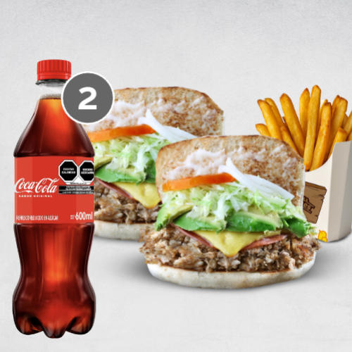 Torta lomo, queso, jamón, lechuga, aguacate, tomate y mayonesa, acompañado de papas francesas individuales y coca cola 600ml