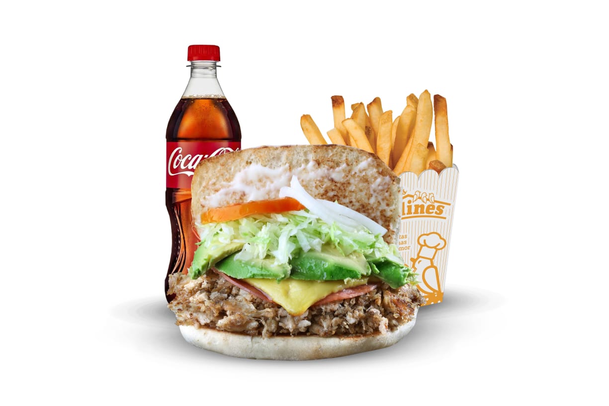 Torta de lomo especial, orden de papas (300gr) y un refresco de 600ml