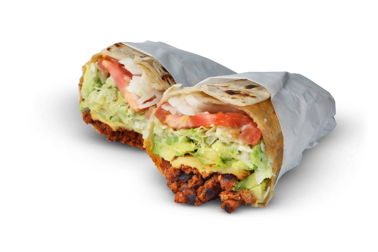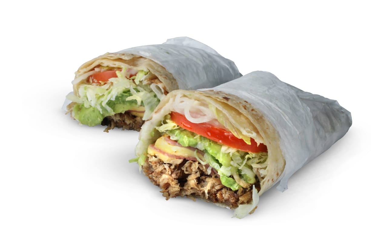 Burrito de deshebrada en chile colorado con aguacate, lechuga, tomate, cebollay mayonesa