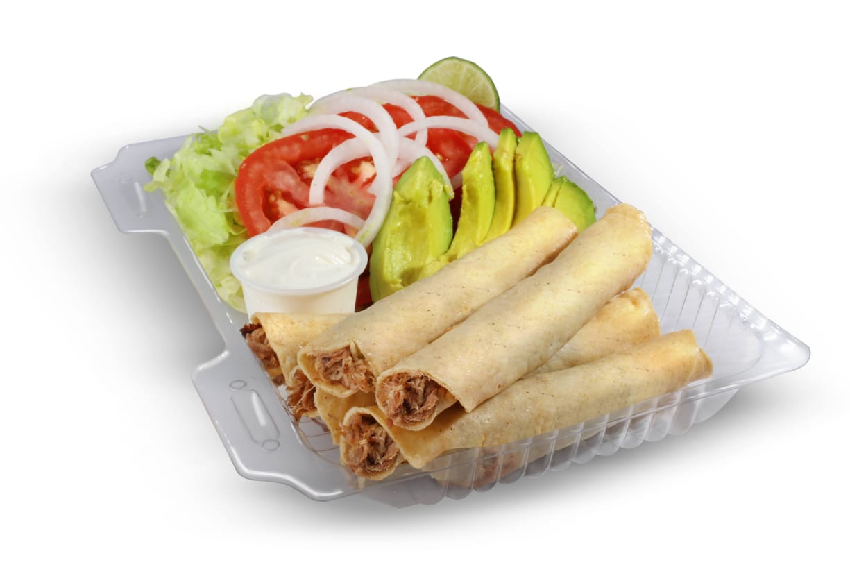 5 Flautas, Crema, aguacate, lechuga, tomate y cebolla