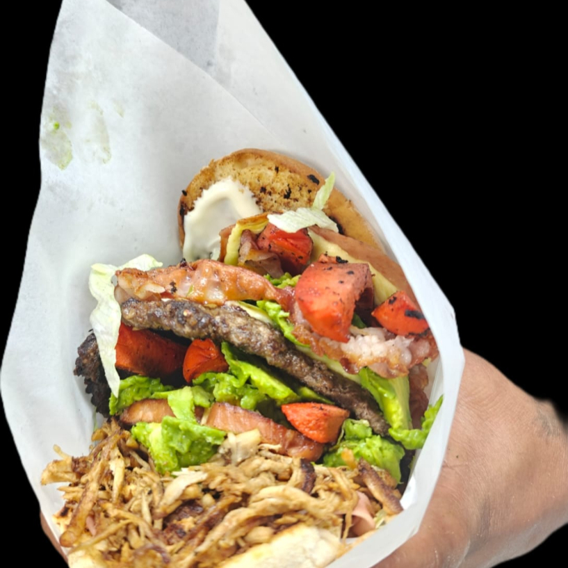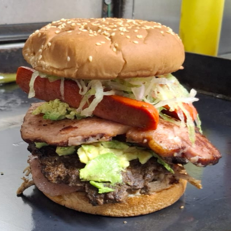 Lomo, carne de hamburguesa, tocino, jamon, queso, aguacate, lechuga, tomate, mayonesa