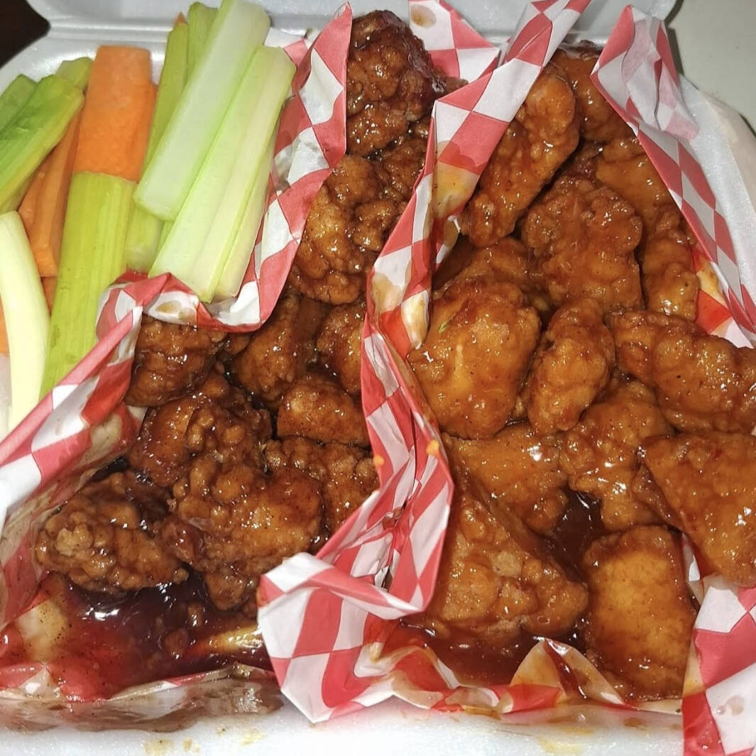 30 pzas boneless, 1 orden de papas,aros de cebolla, ranch, catsup y verdura