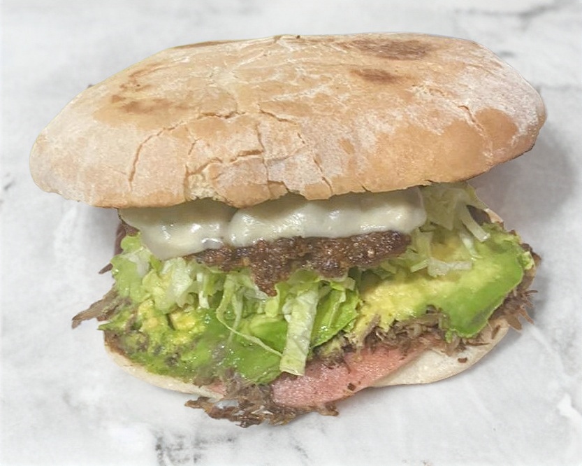 Jamón, 3 quesos, lomo, doble aguacate, lechuga, tomate, tocino, 2 carnes de hamburguesa, ahumada y aderezo.