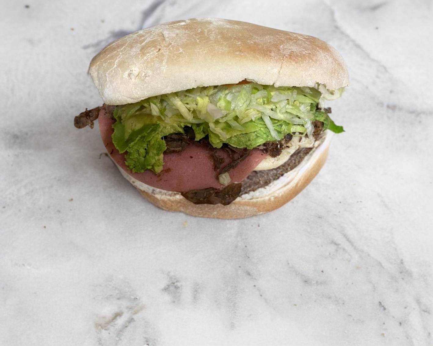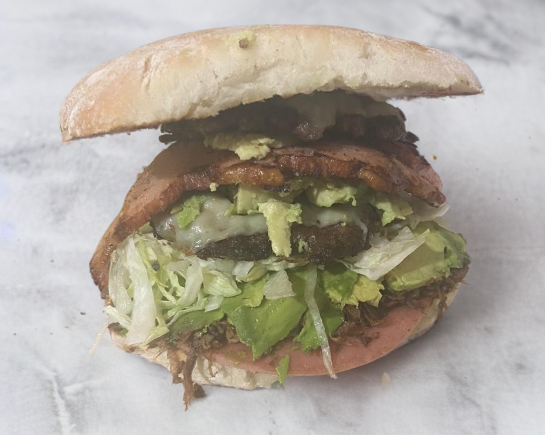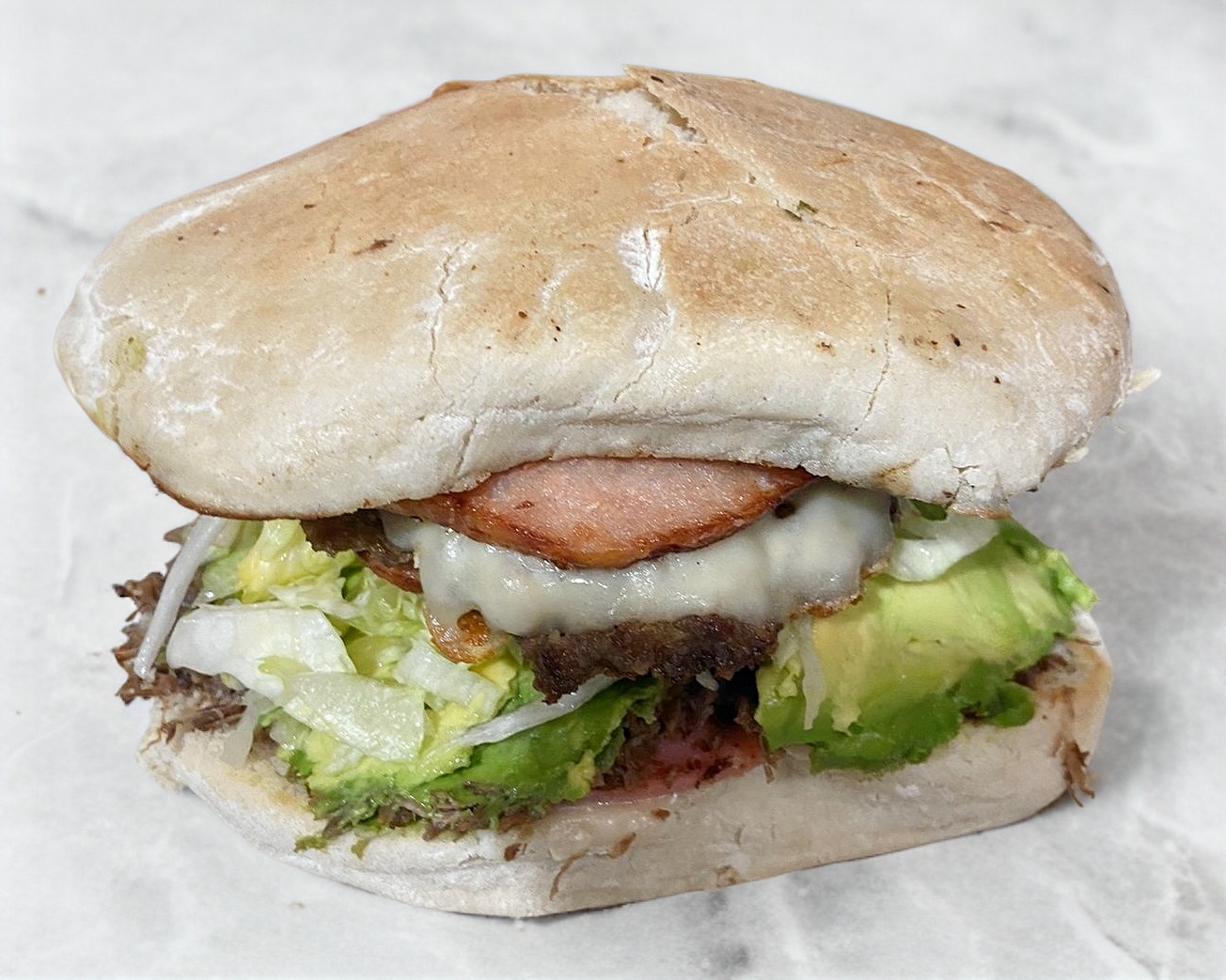 Jamón, 2 quesos, lomo, aguacate, lechuga, tomate, tocino, carne de hamburguesa y aderezo.