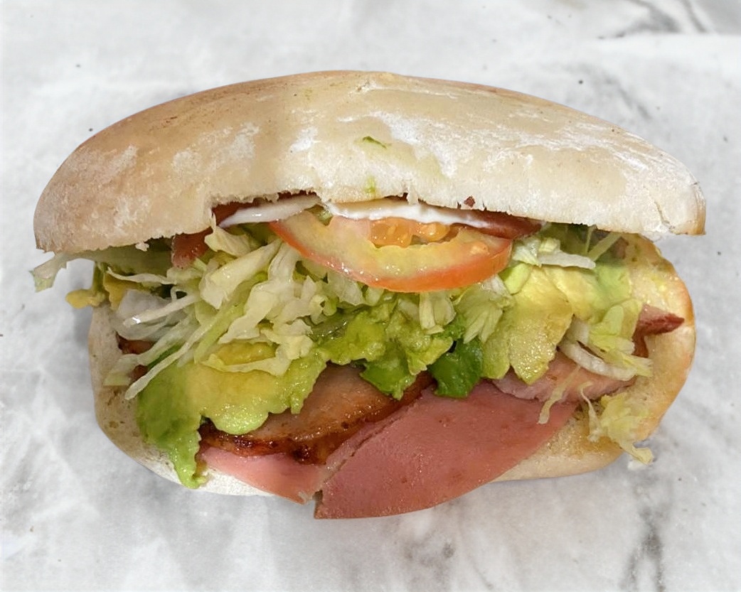 Jamón, queso, aguacate, lechuga, tomate, tocino y aderezo.