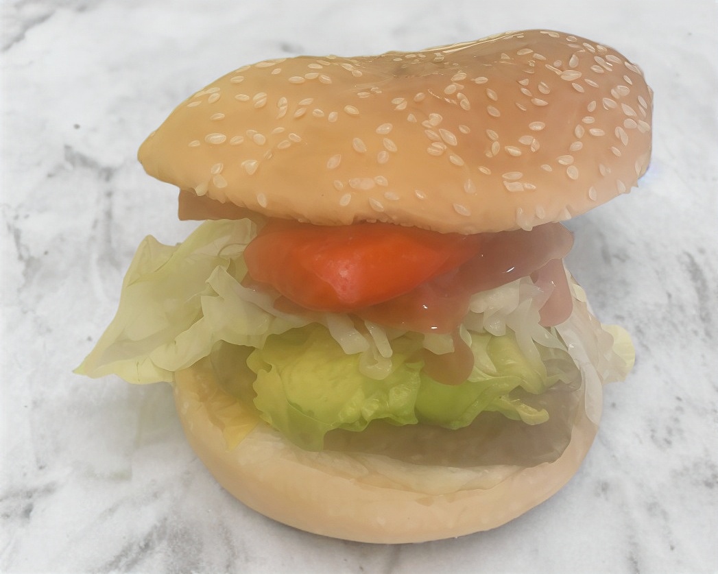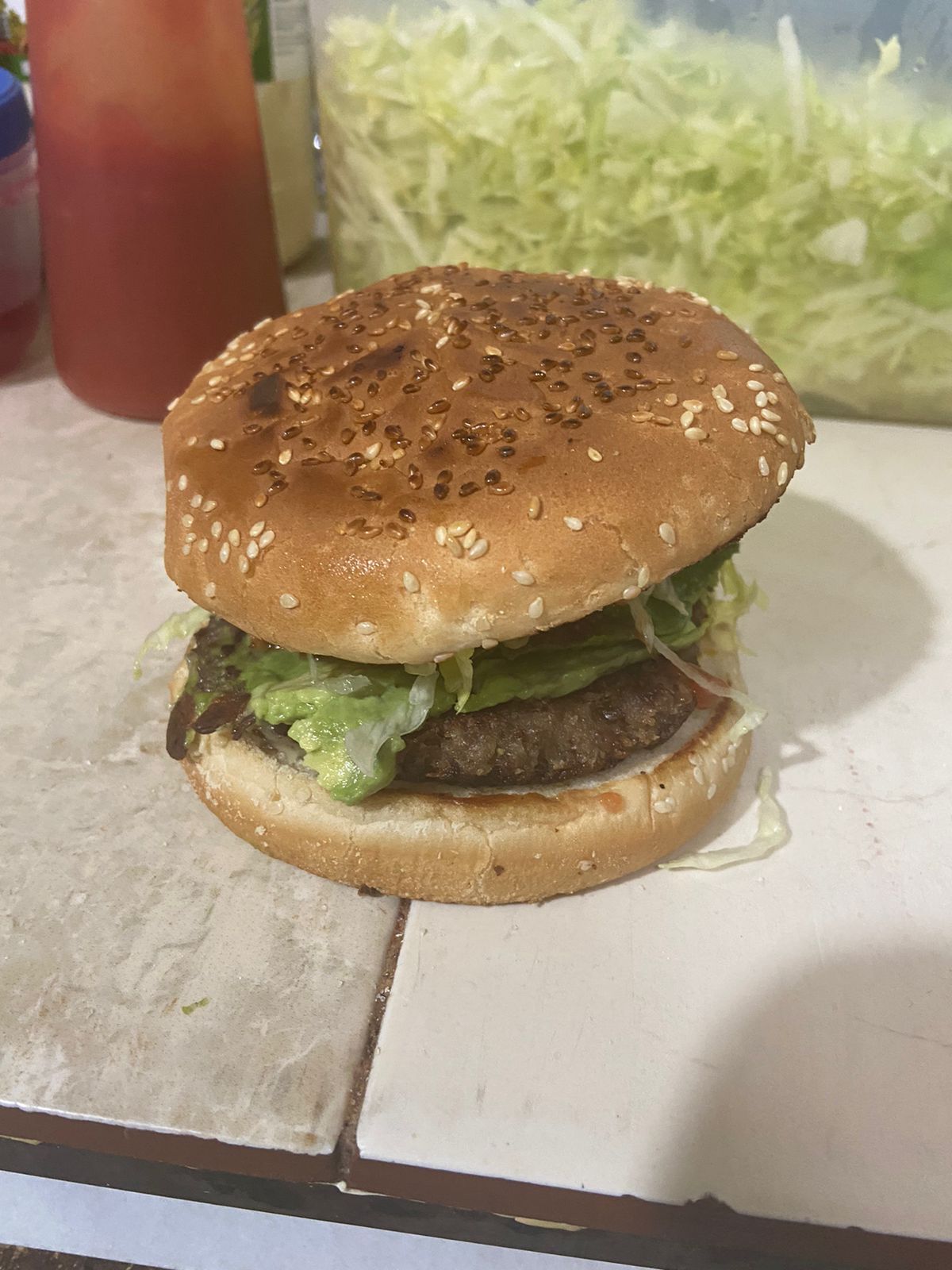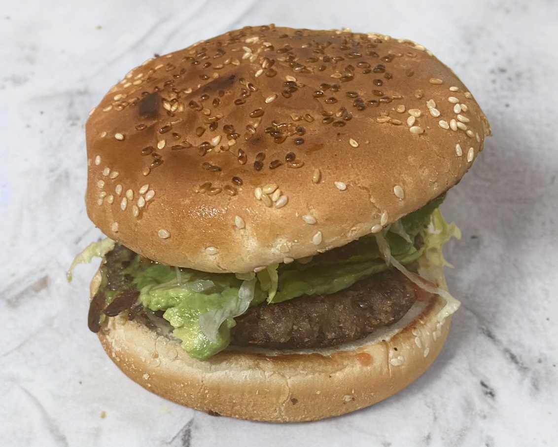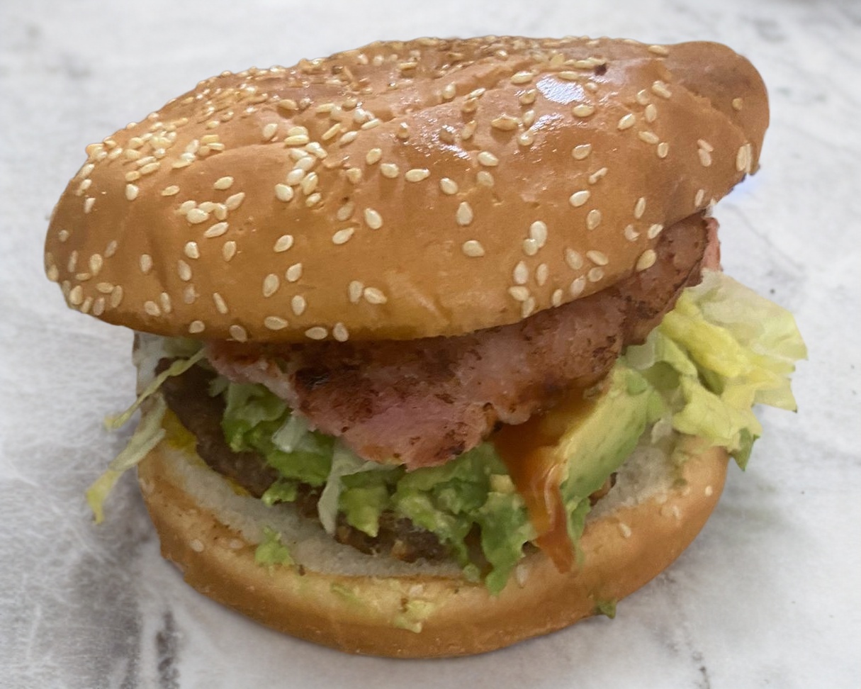 Carne, queso, aguacate, lechuga, tomate, tocino, cátsup y aderezo.