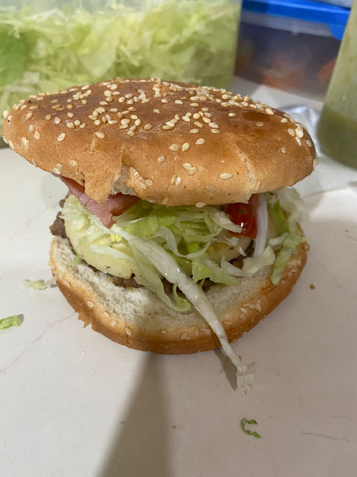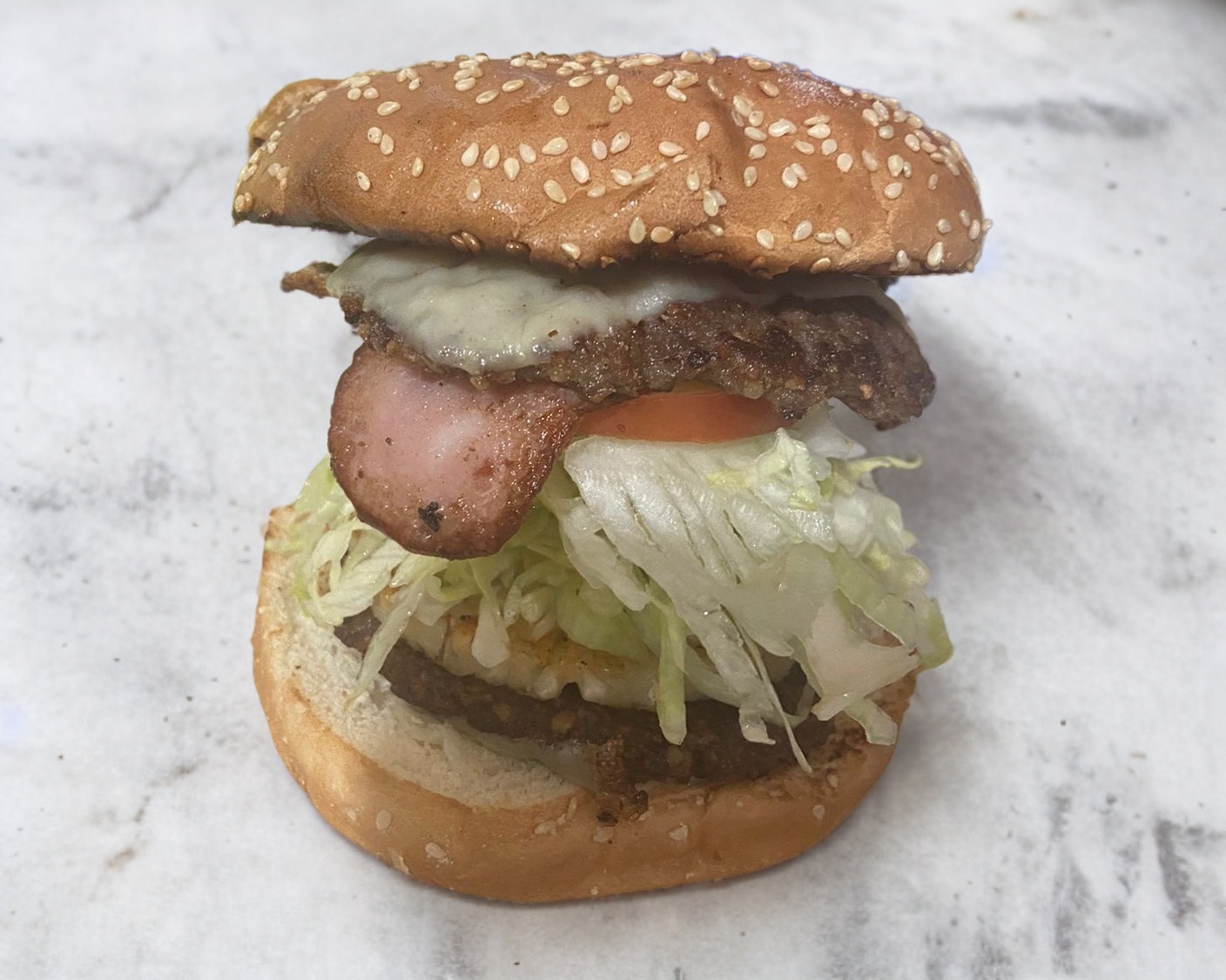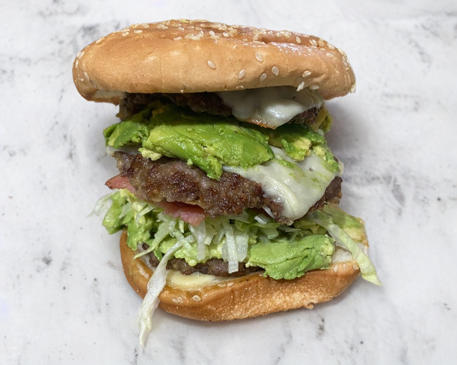 2 Carnes, 2 quesos, aguacate, lechuga, tomate, tocino, cátsup y aderezo.