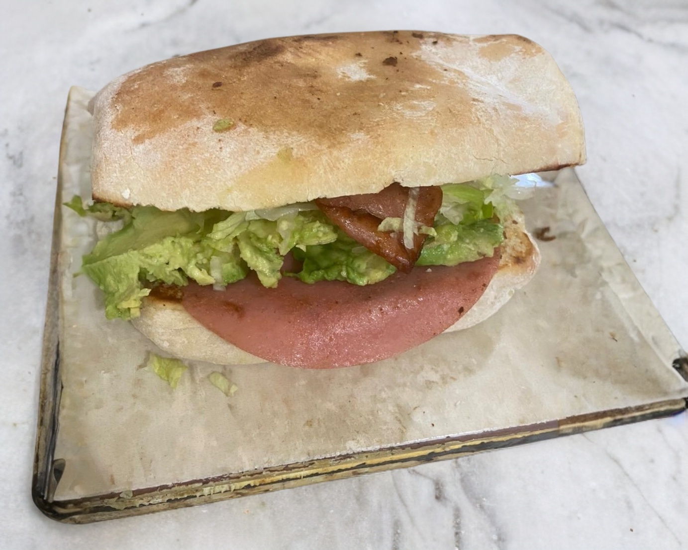 Jamón, queso, ahumada, aguacate, lechuga, tomate, tocino y aderezo.