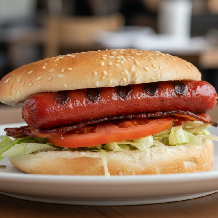 Salchicha para asar, Pan con ajonjoli, carne de res, lechuga, tomate, jamon , queso y aguacate