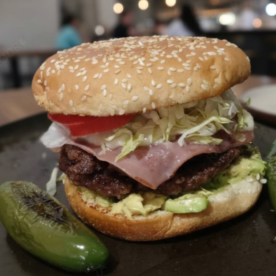 Pan con ajonjoli, carne de res, lechuga, tomate, jamon , queso y aguacate