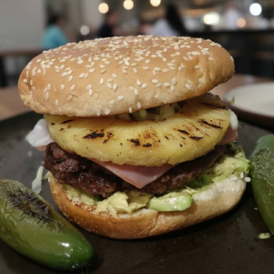 Hamburguesa con piña, carne de res preparada con reseta casera, jamon, queso, aguacate, lechuga y tomate