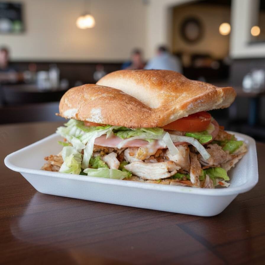 Lomo de cerdo tierno, lechuga fresca, tomate, mayonesa, jamón y queso Laurel, ¡una combinación irresistible de sabor y textura!"