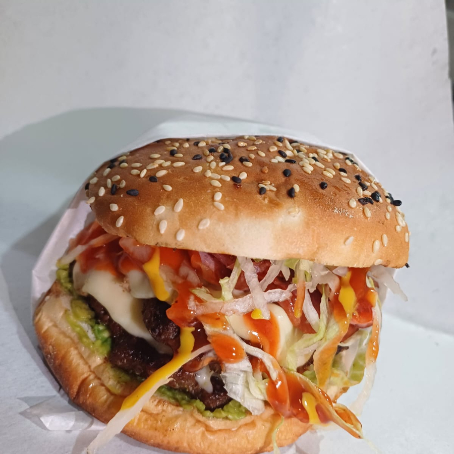 2 carnes, 2 quesos, tocino, aguacate y verdura.