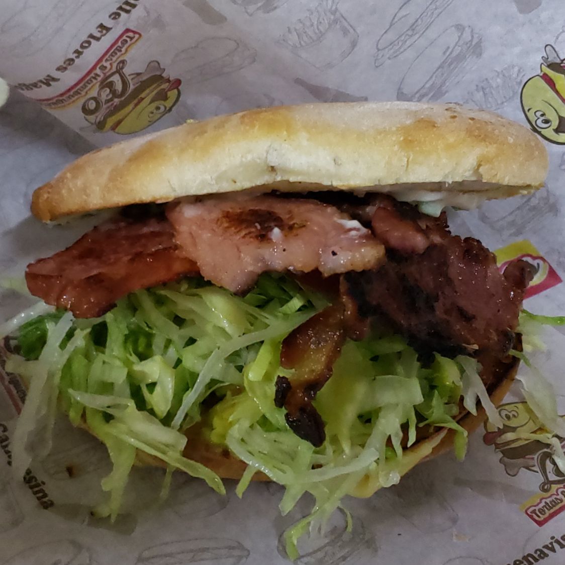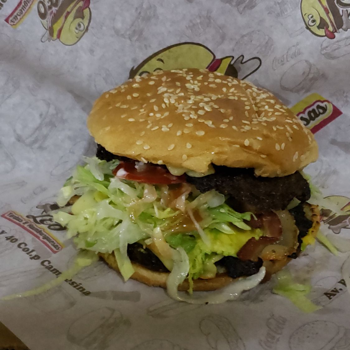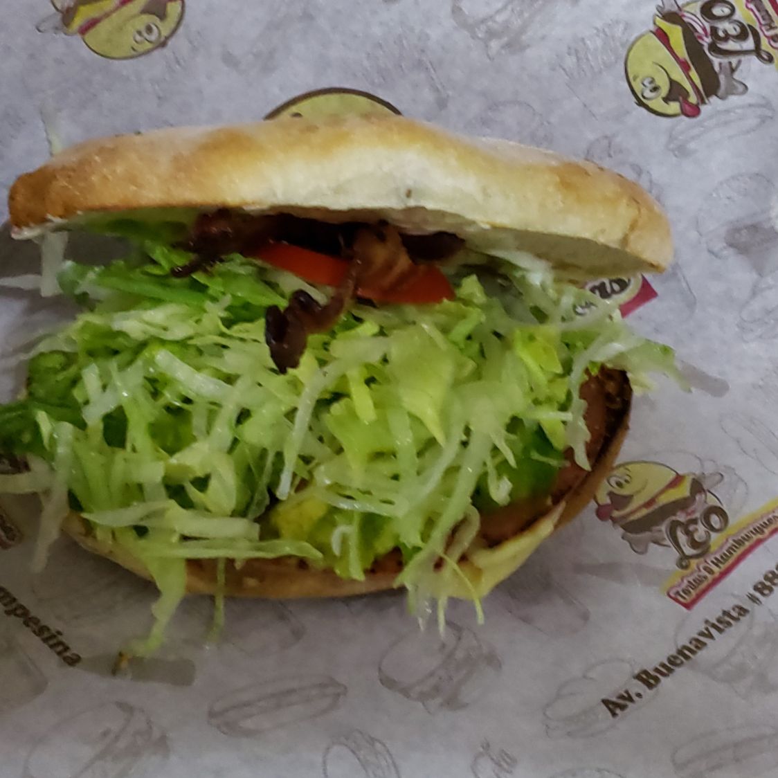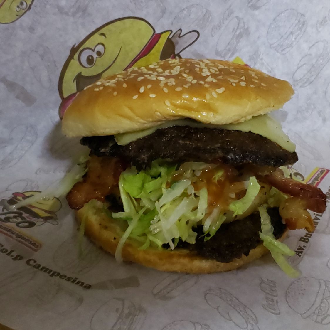 Doble carne, queso, aguacate, tocino, verdura y aderezo.