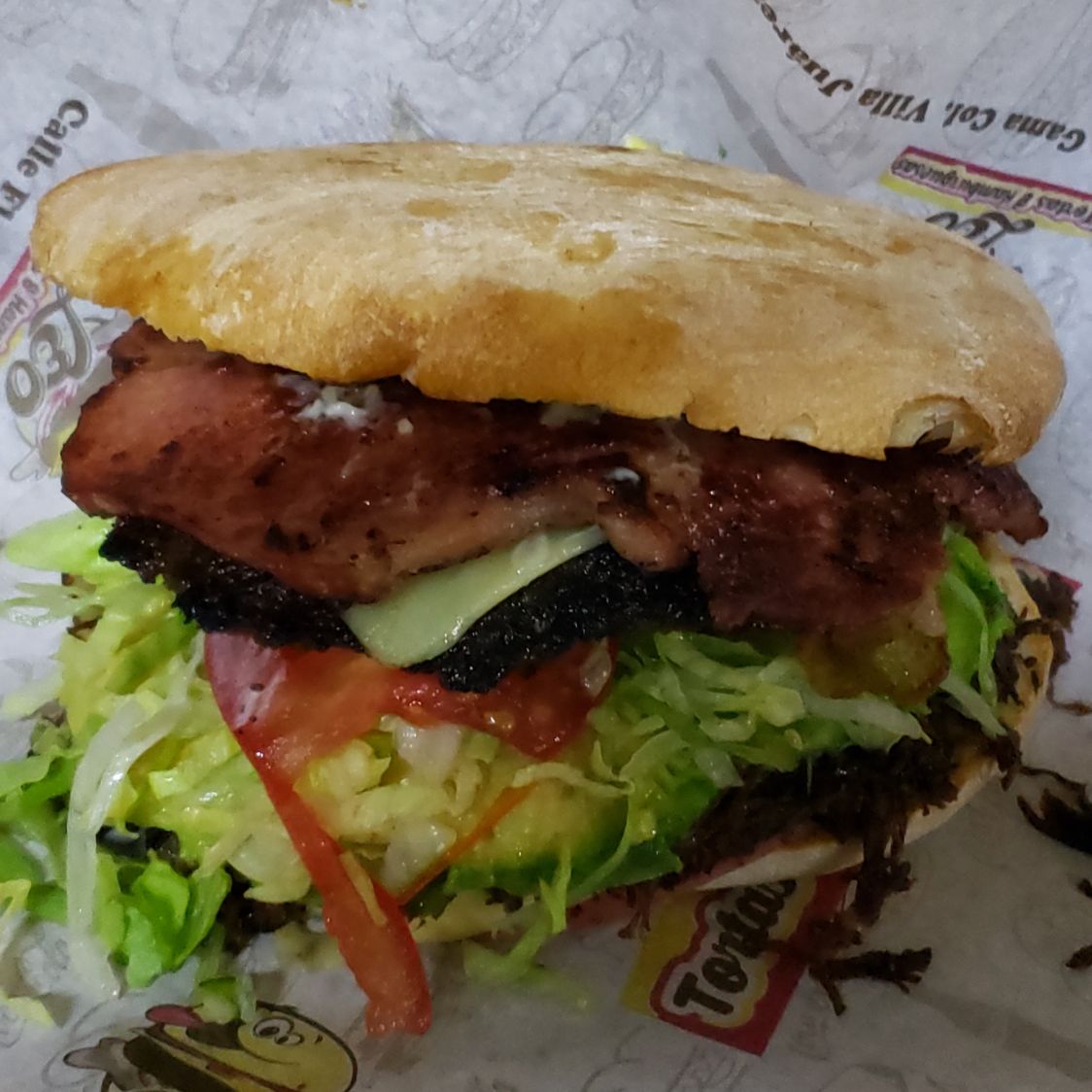 Lomo, jamón, queso, aguacate, carne de hamburguesa, tocino, verdura y aderezo.