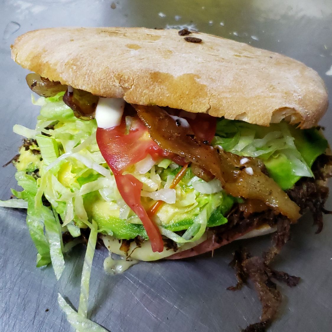 Lomo, jamón, queso, aguacate, tocino, verdura y aderezo.