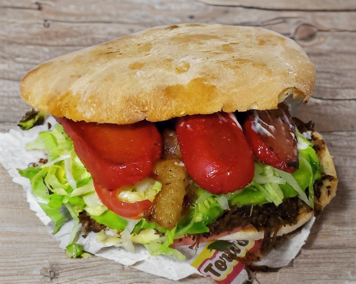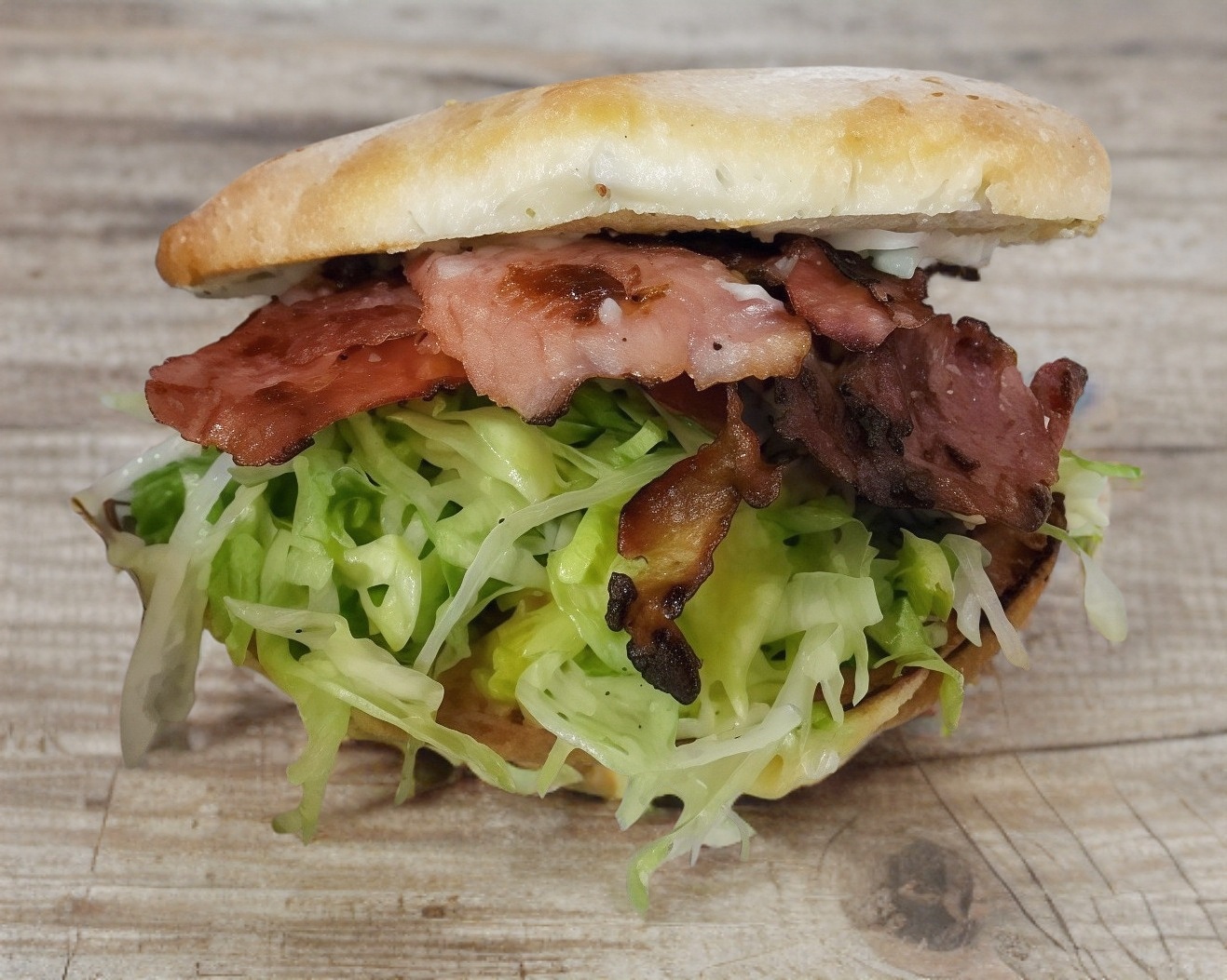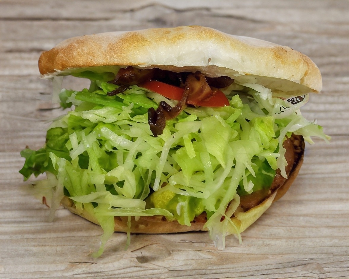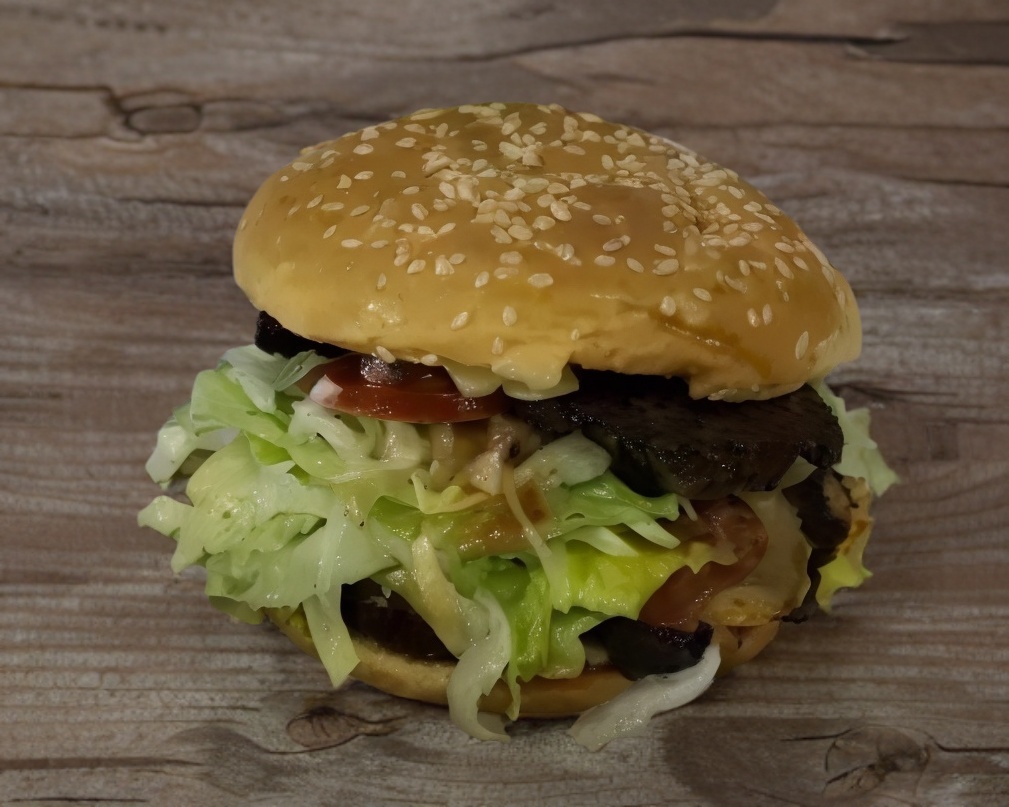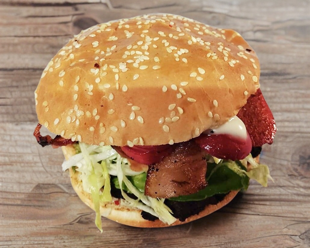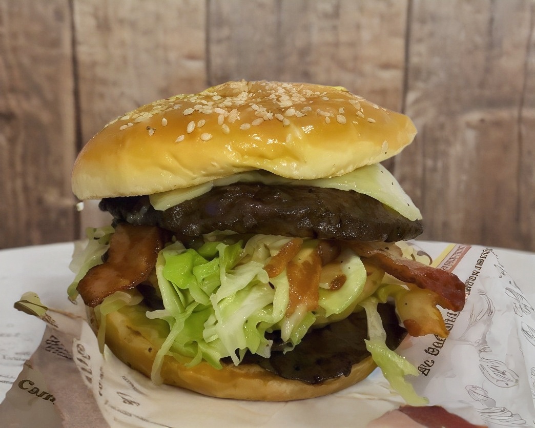 Doble carne, queso, aguacate, tocino, verdura y aderezo.