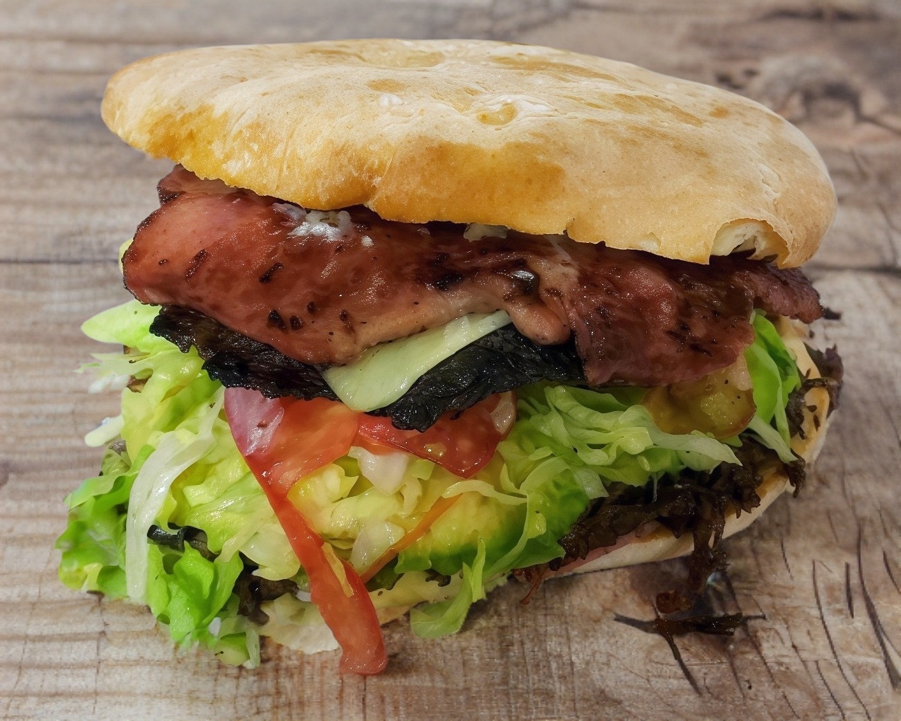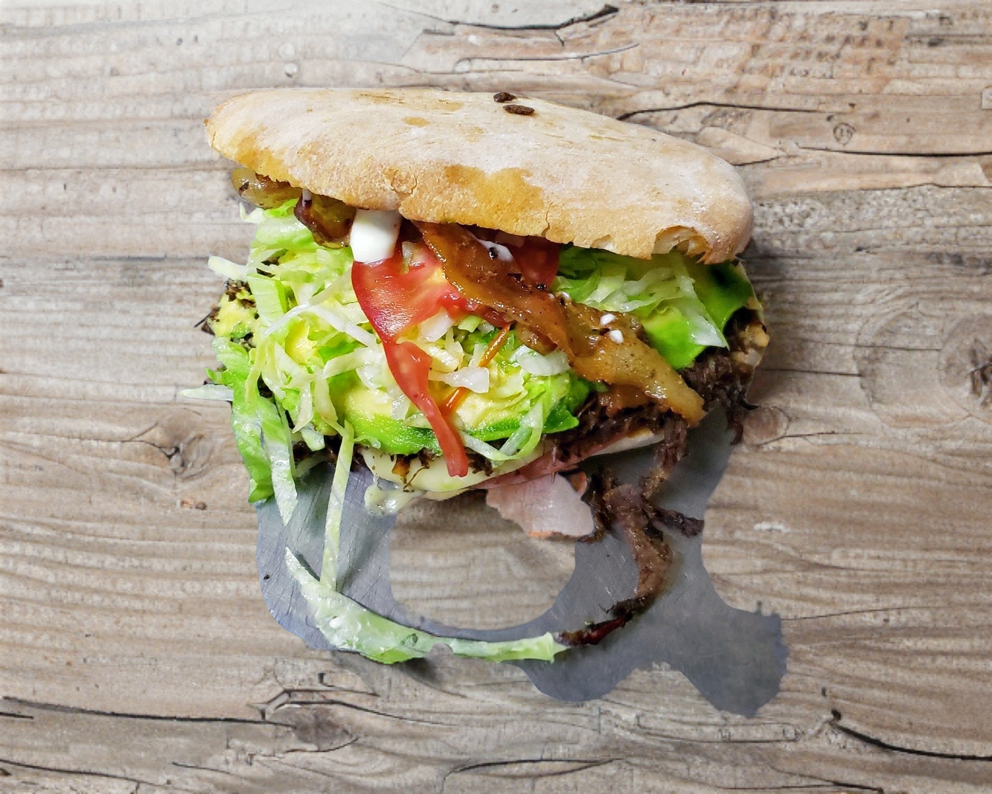 Carne ahumada, tocino, verdura, aguacate, jamón, queso, aderezo.