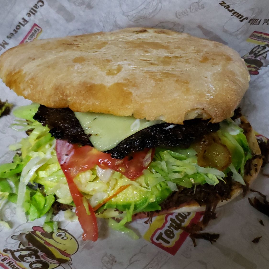 Carne, queso, aguacate, tocino, verdura, aderezo.