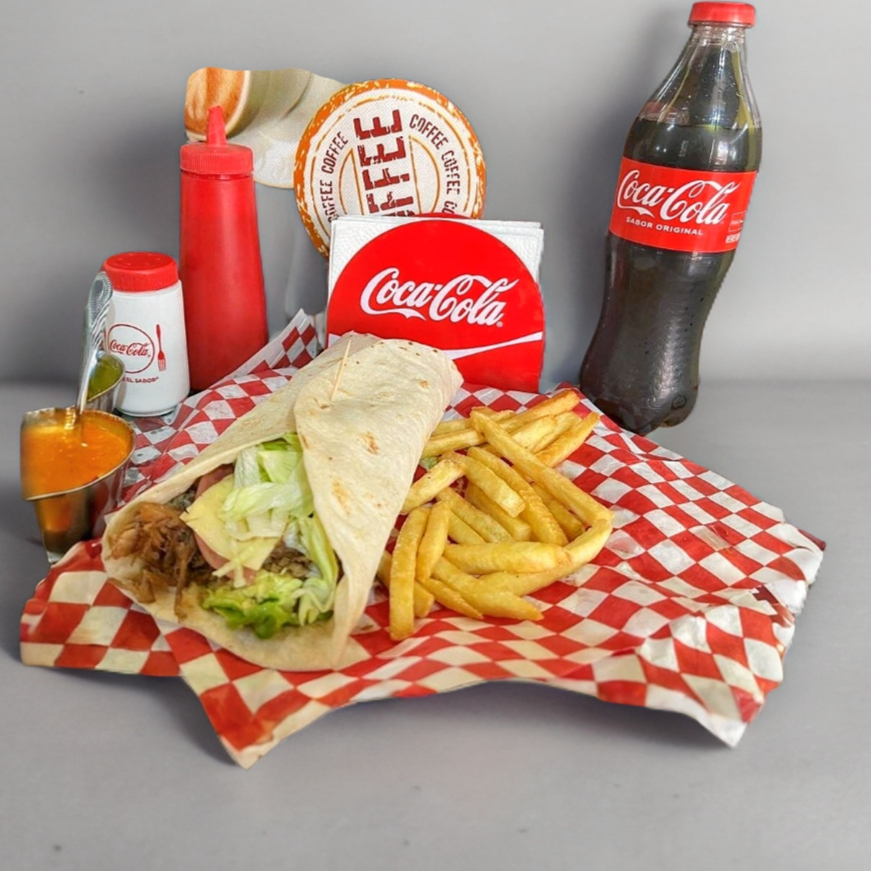 Burrito de lomo con jamon, queso , aguacate , lechuga , tomate y aderezos+ refresco de 600ml+ unas papas francesas