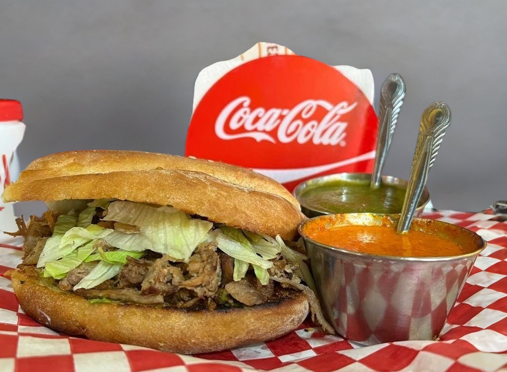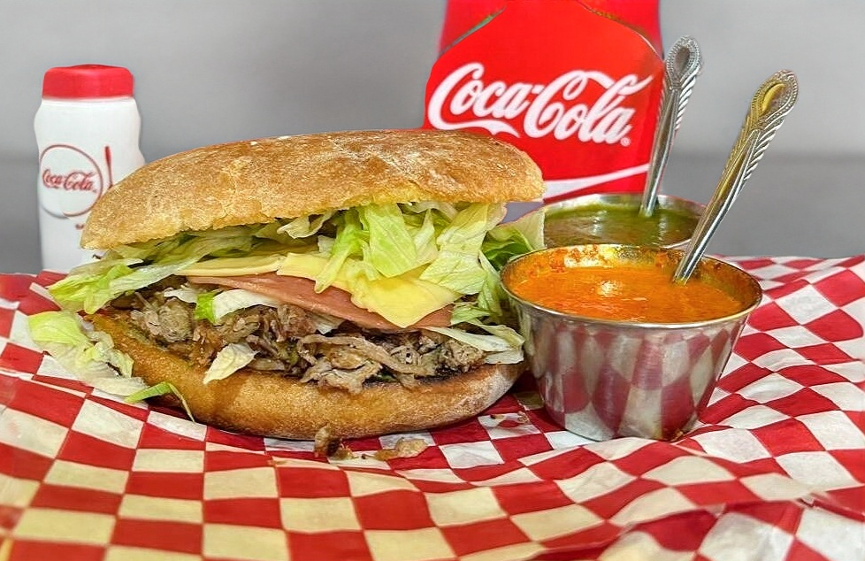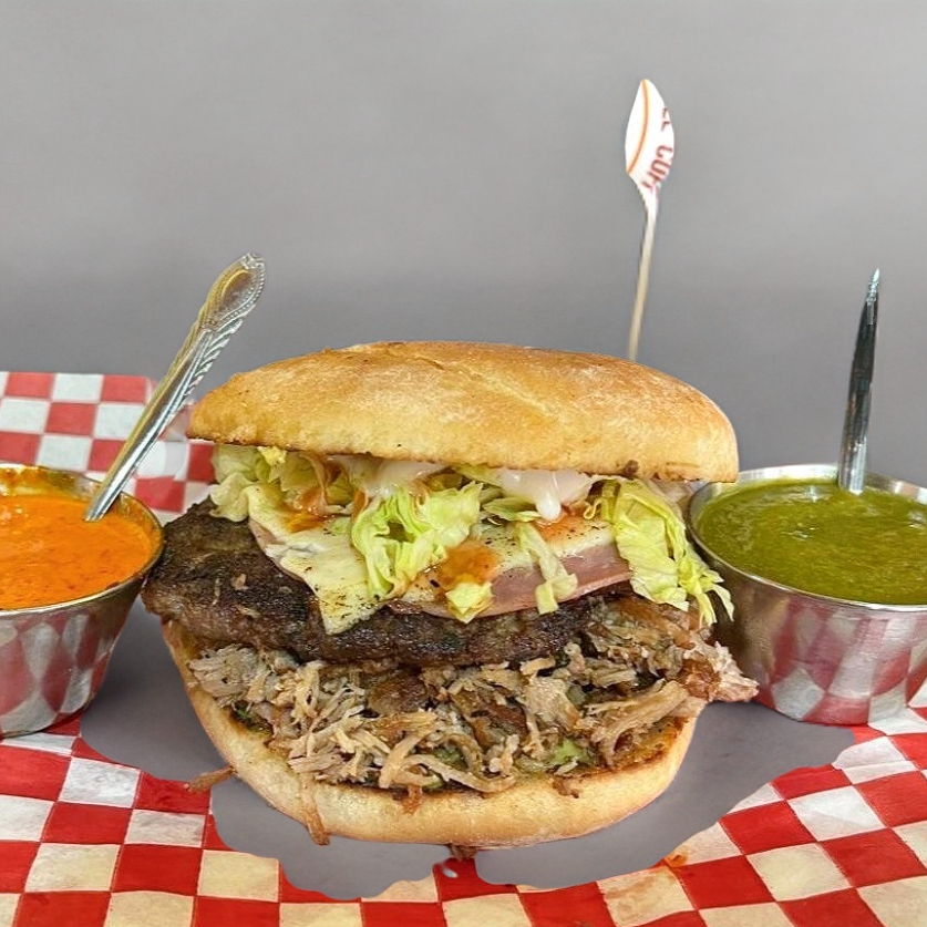 Torta con lomo , carne de hamburguesa , queso , jamon , lechuga , tomate, aguacate y aderezos