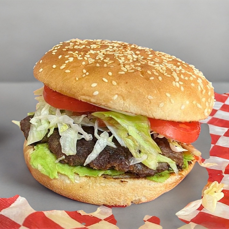 Carne de hamburguesa , aguacate , lechuga , tomate y aderezos