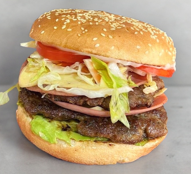 2 carnes de hamburguesa , jamon , queso , aguacate , lechuga, tomate , y aderezos