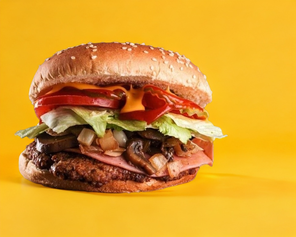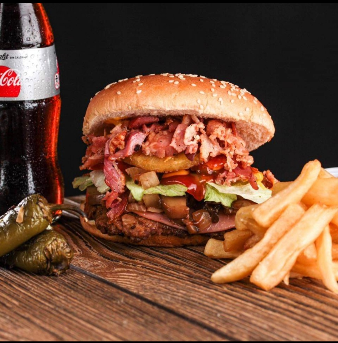 Una hamburguesa con champiñón y cebolla sazonados con maggi, jamón y queso, mayonesa, cátsup, queso para nachos, mostaza, tómate, lechuga y pepinillos.