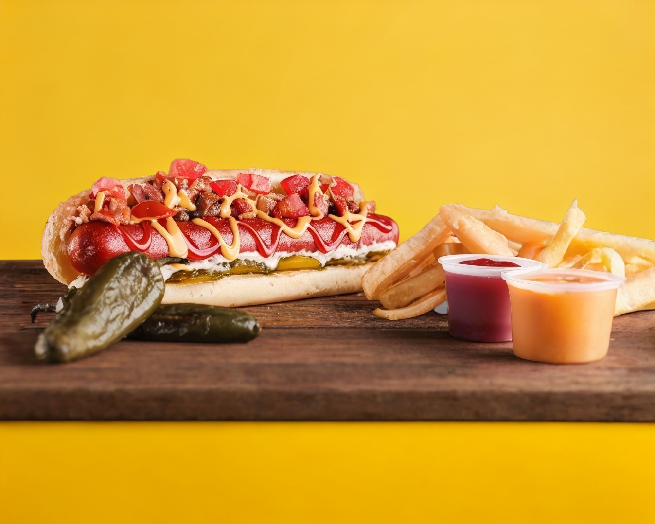 Champiñón y cebolla sazonados con maggi, jamón y queso, mayonesa, cátsup, queso para nachos, mostaza, tómate, lechuga y pepinillos.