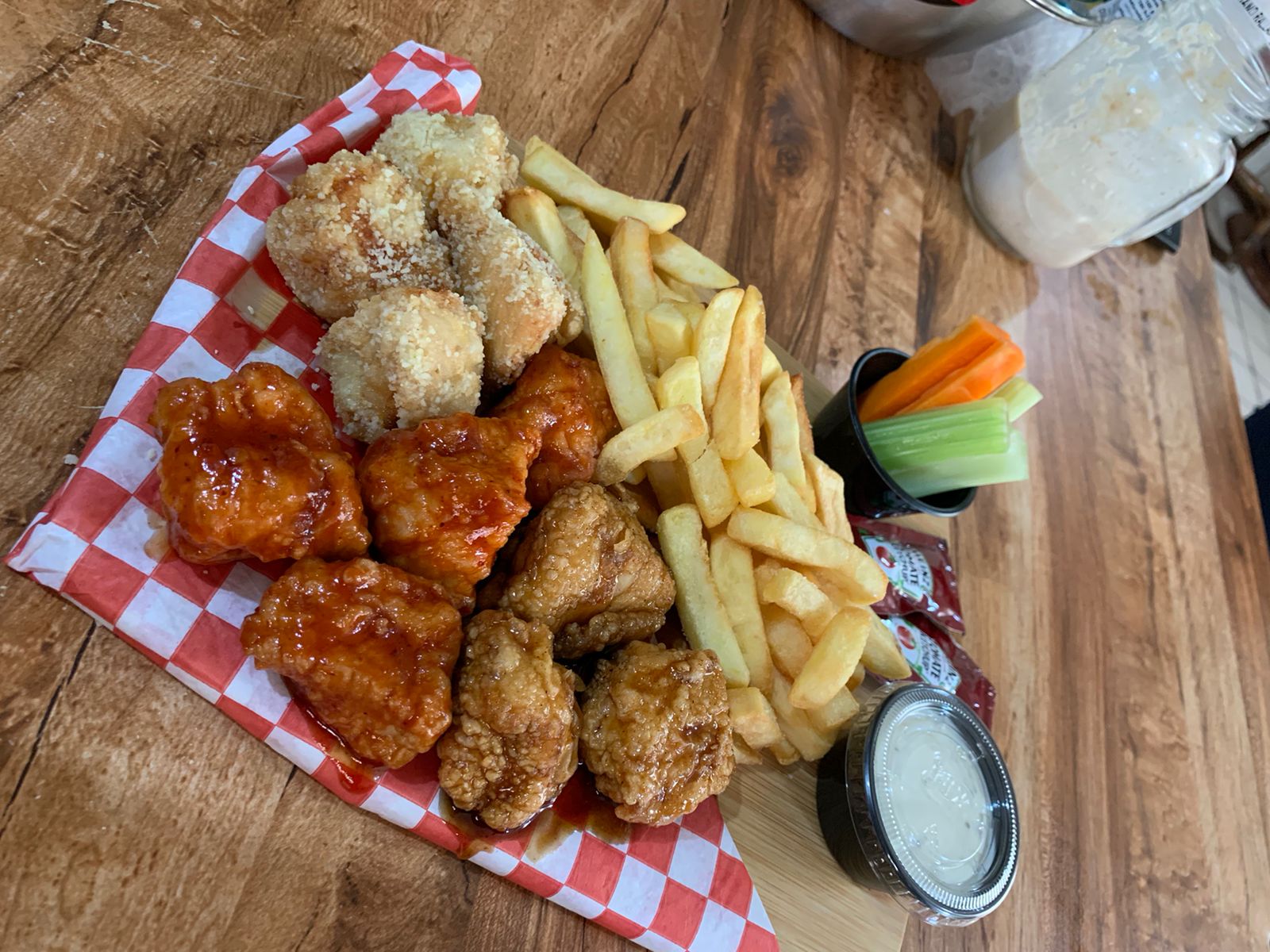 Orden de Papas a la Francesa*1 + Orden de Aros de Cebolla*1 + Verduras y Aderezo*1 + Boneless 1.5 Kg Copiar*1