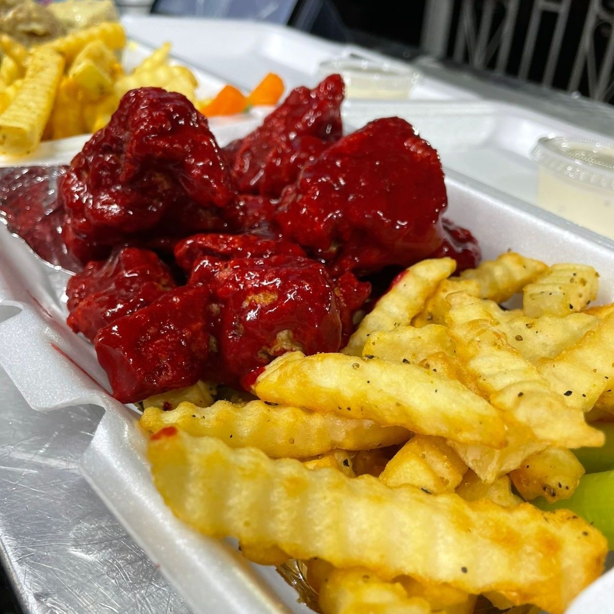 Boneless 500 Gr ( Peso En Crudo) + Porción de Papas a la Francesa*1 + Aros de Cebolla*1 + Verduras y Aderezos*1